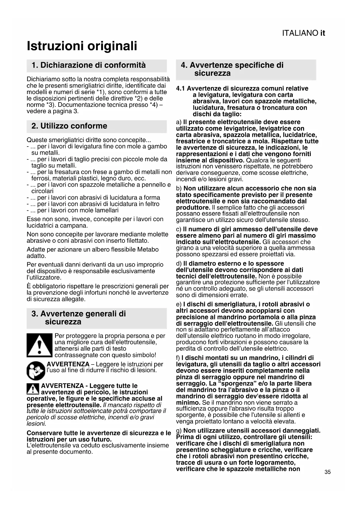 Istruzioni originali Dichiariamo sotto la nostra completa responsabilità che le presenti smerigliatrici diritte, identificate dai modelli e numeri di serie *1), sono conformi a tutte le disposizioni pertinenti delle direttive *2) e delle norme *3). Documentazione tecnica presso *4) – vedere a pagina 3. Queste smerigliatrici diritte sono concepite... - ... per i lavori di levigatura fine con mole a gambo su metalli. - ... per i lavori di taglio precisi con piccole mole da taglio su metalli. - ... per la fresatura con frese a gambo di metalli non ferrosi, materiali plastici, legno duro, ecc. - ... per i lavori con spazzole metalliche a pennello e circolari - ... per i lavori con abrasivi di lucidatura a forma - ... per i lavori con abrasivi di lucidatura in feltro - ... per i lavori con mole lamellari Esse non sono, invece, concepite per i lavori con lucidatrici a campana. Non sono concepite per lavorare mediante molette abrasive o coni abrasivi con inserto filettato. Adatte per azionare un albero flessibile Metabo adatto. Per eventuali danni derivanti da un uso improprio del dispositivo è responsabile esclusivamente l’utilizzatore. È obbligatorio rispettare le prescrizioni generali per la prevenzione degli infortuni nonché le avvertenze di sicurezza allegate. Per proteggere la propria persona e per una migliore cura dell'elettroutensile, attenersi alle parti di testo contrassegnate con questo simbolo! AVVERTENZA – Leggere le istruzioni per l’uso al fine di ridurre il rischio di lesioni. AVVERTENZA - Leggere tutte le avvertenze di pericolo, le istruzioni operative, le figure e le specifiche accluse al presente elettroutensile. Il mancato rispetto di tutte le istruzioni sottoelencate potrà comportare il pericolo di scosse elettriche, incendi e/o gravi lesioni. Conservare tutte le avvertenze di sicurezza e le istruzioni per un uso futuro. L'elettroutensile va ceduto esclusivamente insieme al presente documento.
