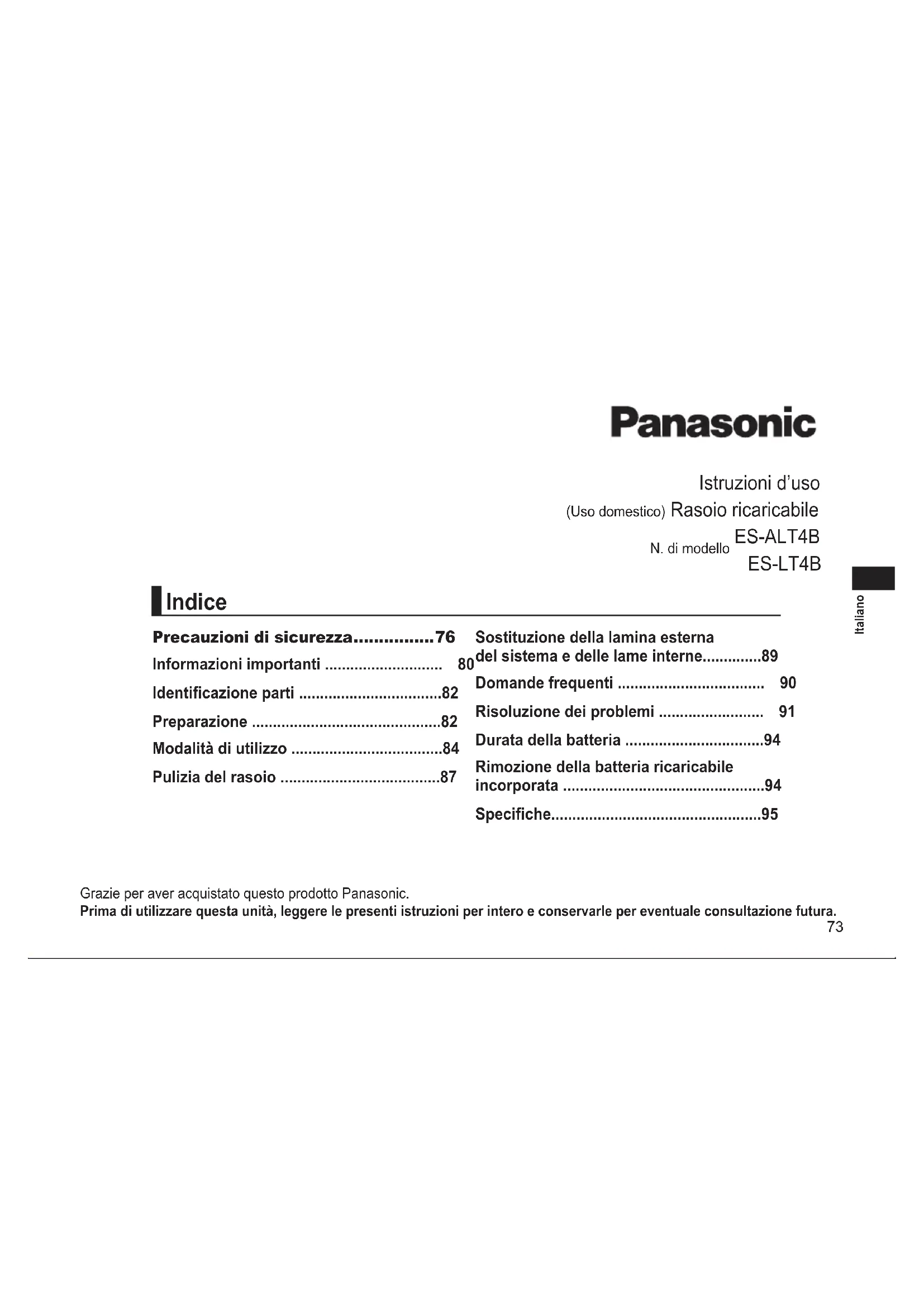 - ES‑LT4B Grazie per aver acquistato questo prodotto Panasonic. Primadiutilizzarequestaunità,leggerelepresentiistruzioniperinteroeconservarlepereventualeconsultazionefutura. Precauzioni di sicurezza p. 76