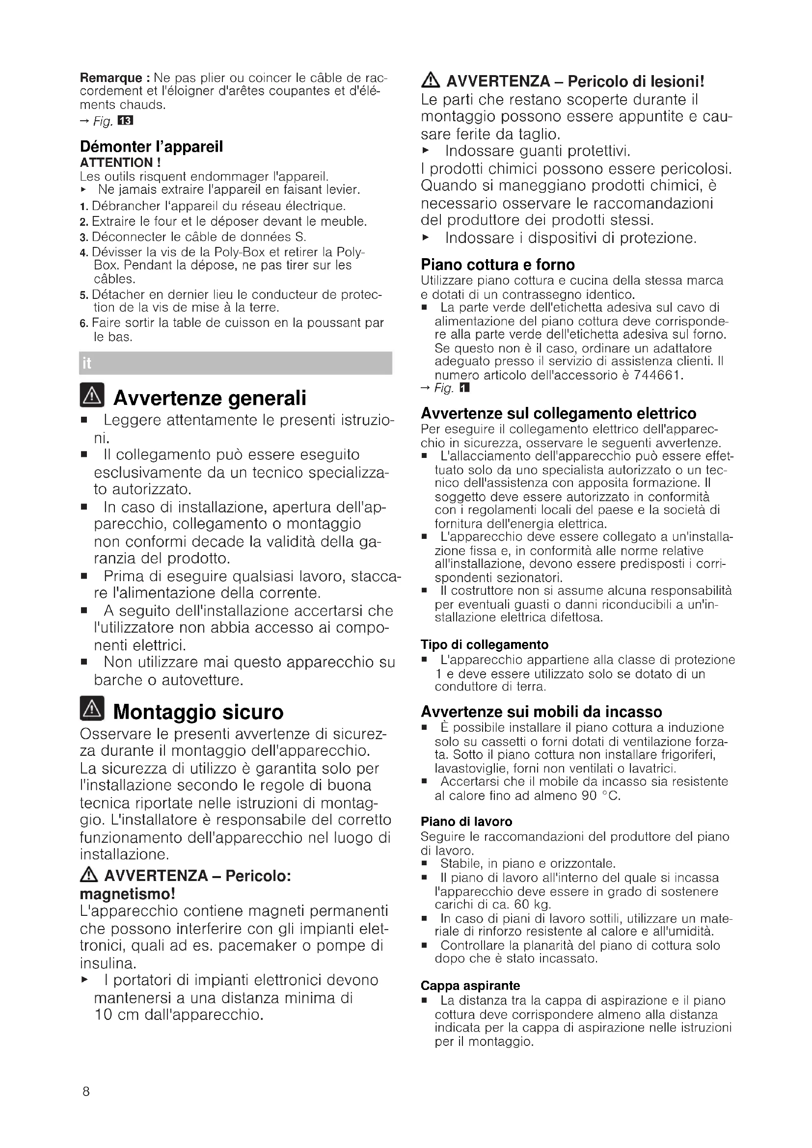 Avvertenze generali ¡ Leggere attentamente le presenti istruzio- ni. ¡ Il collegamento può essere eseguito esclusivamente da un tecnico specializza- to autorizzato. ¡ In caso di installazione, apertura dell'ap- parecchio, collegamento o montaggio non conformi decade la validità della ga- ranzia del prodotto. ¡ Prima di eseguire qualsiasi lavoro, stacca- re l'alimentazione della corrente. ¡ A seguito dell'installazione accertarsi che l'utilizzatore non abbia accesso ai compo- nenti elettrici. ¡ Non utilizzare mai questo apparecchio su barche o autovetture. Montaggio sicuro Osservare le presenti avvertenze di sicurez- za durante il montaggio dell'apparecchio. La sicurezza di utilizzo è garantita solo per l'installazione secondo le regole di buona tecnica riportate nelle istruzioni di montag- gio. L'installatore è responsabile del corretto funzionamento dell'apparecchio nel luogo di installazione. AVVERTENZA‒Pericolo: magnetismo! L'apparecchio contiene magneti permanenti che possono interferire con gli impianti elet- tronici, quali ades. pacemaker o pompe di insulina. ▶ I portatori di impianti elettronici devono mantenersi a una distanza minima di 10cm dall'apparecchio. AVVERTENZA‒Pericolo di lesioni! Le parti che restano scoperte durante il montaggio possono essere appuntite e cau- sare ferite da taglio. ▶ Indossare guanti protettivi. I prodotti chimici possono essere pericolosi. Quando si maneggiano prodotti chimici, è necessario osservare le raccomandazioni del produttore dei prodotti stessi. ▶ Indossare i dispositivi di protezione. Piano cottura e forno Utilizzare piano cottura e cucina della stessa marca e dotati di un contrassegno identico. ¡ La parte verde dell'etichetta adesiva sul cavo di alimentazione del piano cottura deve corrisponde- re alla parte verde dell'etichetta adesiva sul forno. Se questo non è il caso, ordinare un adattatore adeguato presso il servizio di assistenza clienti. Il numero articolo dell'accessorio è 744661.