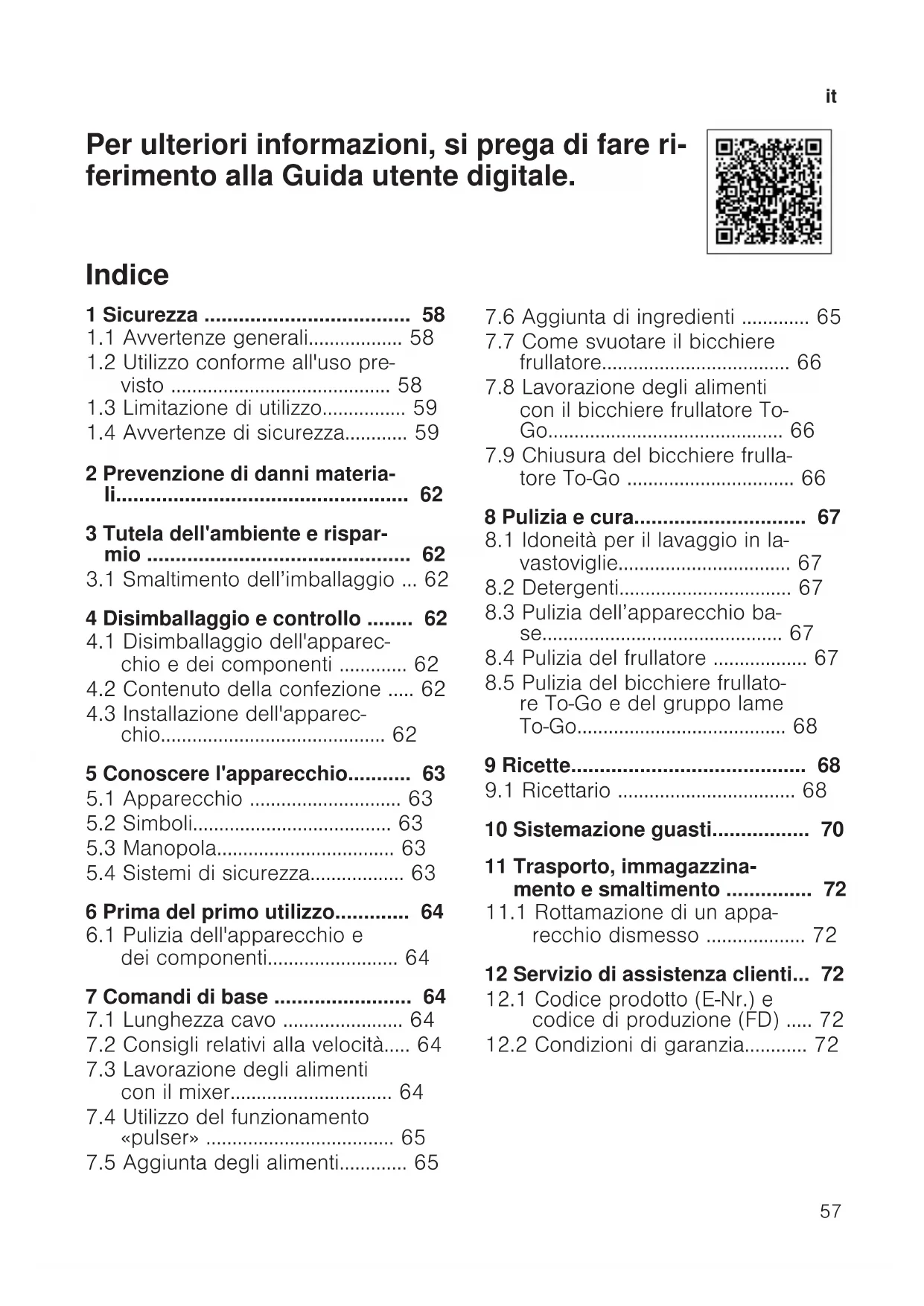 Per ulteriori informazioni, si prega di fare ri- ferimento alla Guida utente digitale. Indice 1 Sicurezza ....................................58