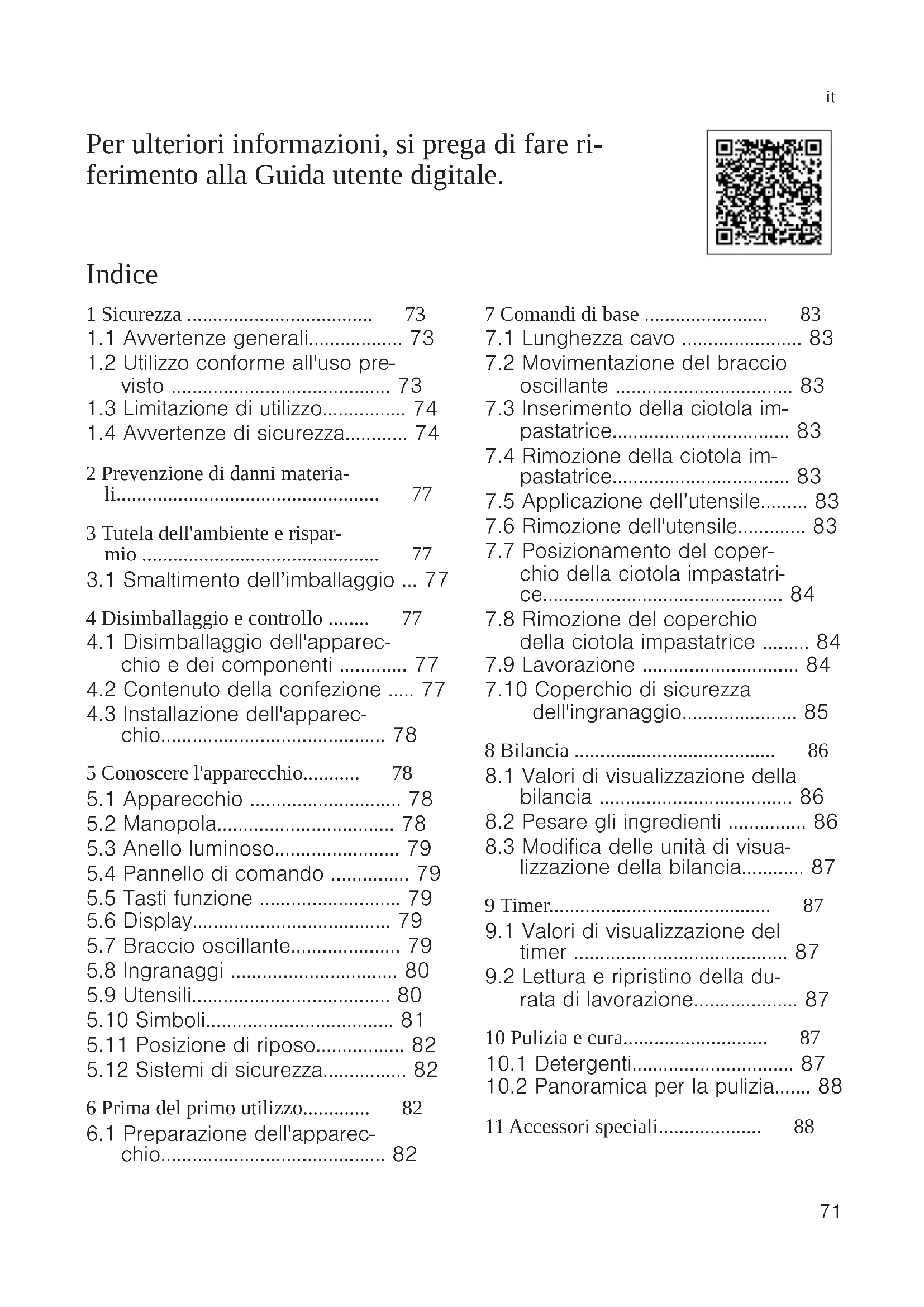 Per ulteriori informazioni, si prega di fare ri- ferimento alla Guida utente digitale. Indice 1 Sicurezza ....................................73