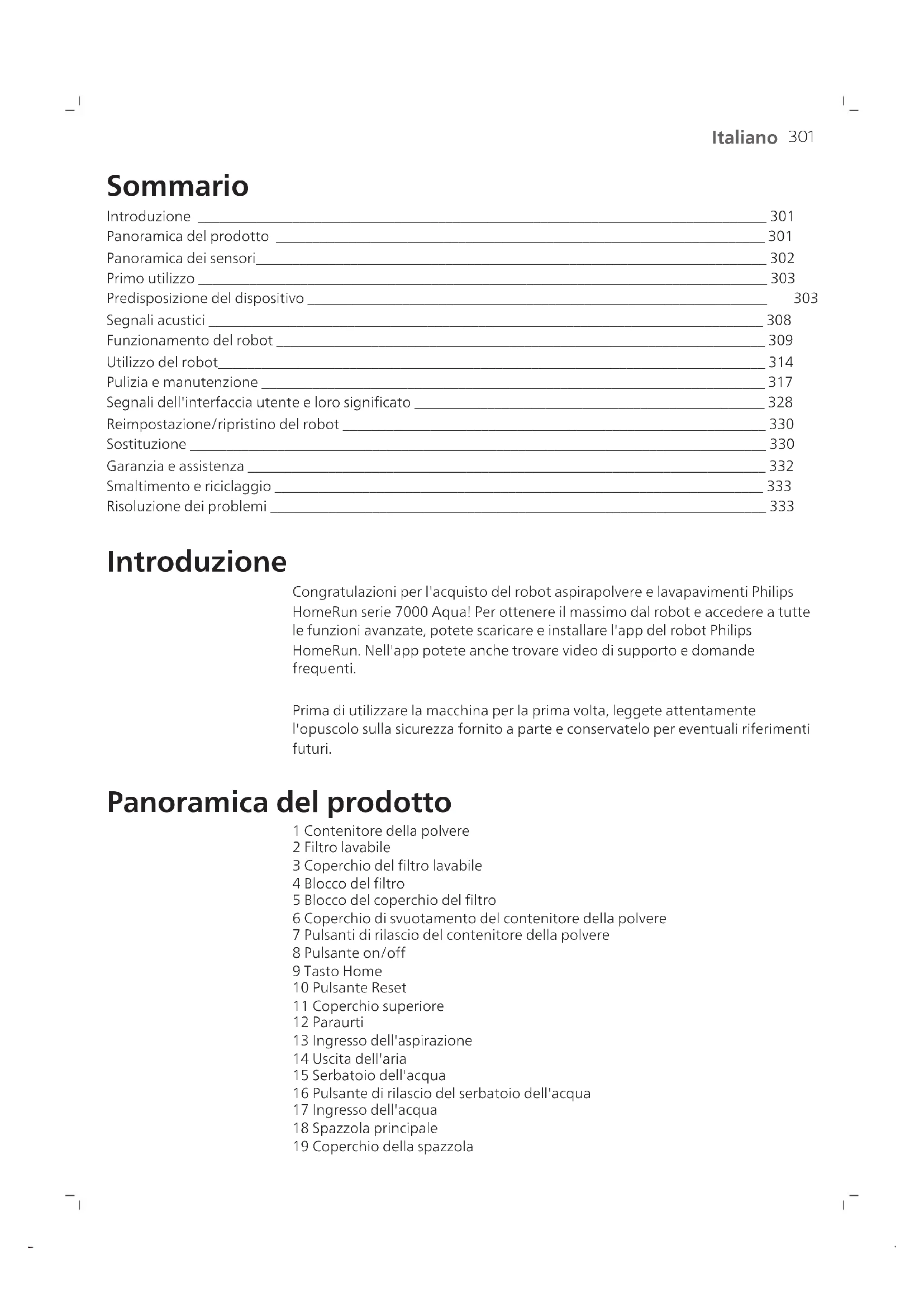 Italiano Sommario Introduzione ______________________________________________________________________________ 301 Panoramica del prodotto ___________________________________________________________________ 301 Panoramica dei sensori______________________________________________________________________ 302 Primo utilizzo ______________________________________________________________________________ 303 Predisposizione del dispositivo _______________________________________________________________ 303 Segnali acustici ____________________________________________________________________________ 308 Funzionamento del robot ___________________________________________________________________ 309 Utilizzo del robot___________________________________________________________________________ 314 Pulizia e manutenzione _____________________________________________________________________ 317 Segnali dell'interfaccia utente e loro significato ________________________________________________ 328 Reimpostazione/ripristino del robot __________________________________________________________ 330 Sostituzione _______________________________________________________________________________ 330 Garanzia e assistenza _______________________________________________________________________ 332 Smaltimento e riciclaggio ___________________________________________________________________ 333 Risoluzione dei problemi ____________________________________________________________________ 333 Introduzione Congratulazioni per l'acquisto del robot aspirapolvere e lavapavimenti Philips HomeRun serie 7000 Aqua! Per ottenere il massimo dal robot e accedere a tutte le funzioni avanzate, potete scaricare e installare l'app del robot Philips HomeRun. Nell'app potete anche trovare video di supporto e domande frequenti. Prima di utilizzare la macchina per la prima volta, leggete attentamente l'opuscolo sulla sicurezza fornito a parte e conservatelo per eventuali riferimenti futuri. Panoramica del prodotto 1 Contenitore della polvere 2 Filtro lavabile 3 Coperchio del filtro lavabile 4 Blocco del filtro 5 Blocco del coperchio del filtro 6 Coperchio di svuotamento del contenitore della polvere 7 Pulsanti di rilascio del contenitore della polvere 8 Pulsante on/off 9 Tasto Home 10 Pulsante Reset 11 Coperchio superiore 12 Paraurti 13 Ingresso dell'aspirazione 14 Uscita dell'aria 15 Serbatoio dell'acqua 16 Pulsante di rilascio del serbatoio dell'acqua 17 Ingresso dell'acqua 18 Spazzola principale 19 Coperchio della spazzola302 Italiano 20 Pulsante di sgancio del coperchio della spazzola 21 Ruote principali 22 Ruota anteriore girevole 23 Punti di contatto per la ricarica (robot) 24 Spazzola puliscibordi 25 Supporto panno umido 26 Panno per il lavaggio (2x) 27 Cavo di alimentazione (XU7000) 28 Stazione (di ricarica) (XU7000) 29 Finestra sensore ad infrarossi (XU7000) 30 Punti di contatto per la ricarica (stazione) 31 Presa del cavo di alimentazione 32 Tappetino (XU7000) 33 Sacchetto per la polvere (2x) (XU7100) 34 Coperchio del contenitore 35 Scomparto del sacchetto per la polvere 36 Stazione di svuotamento automatico (XU7100) 37 Indicatore luminoso 38 Finestra sensore ad infrarossi 39 Rampa 40 Ingresso svuotamento automatico 41 Uscita dell'aria a svuotamento automatico 42 Punti di contatto per la ricarica (stazione) 43 Ventola di scarico 44 Strumento per la pulizia della spazzola 45 Presa del cavo di alimentazione 46 Cavo di alimentazione (XU7100) Panoramica dei sensori
