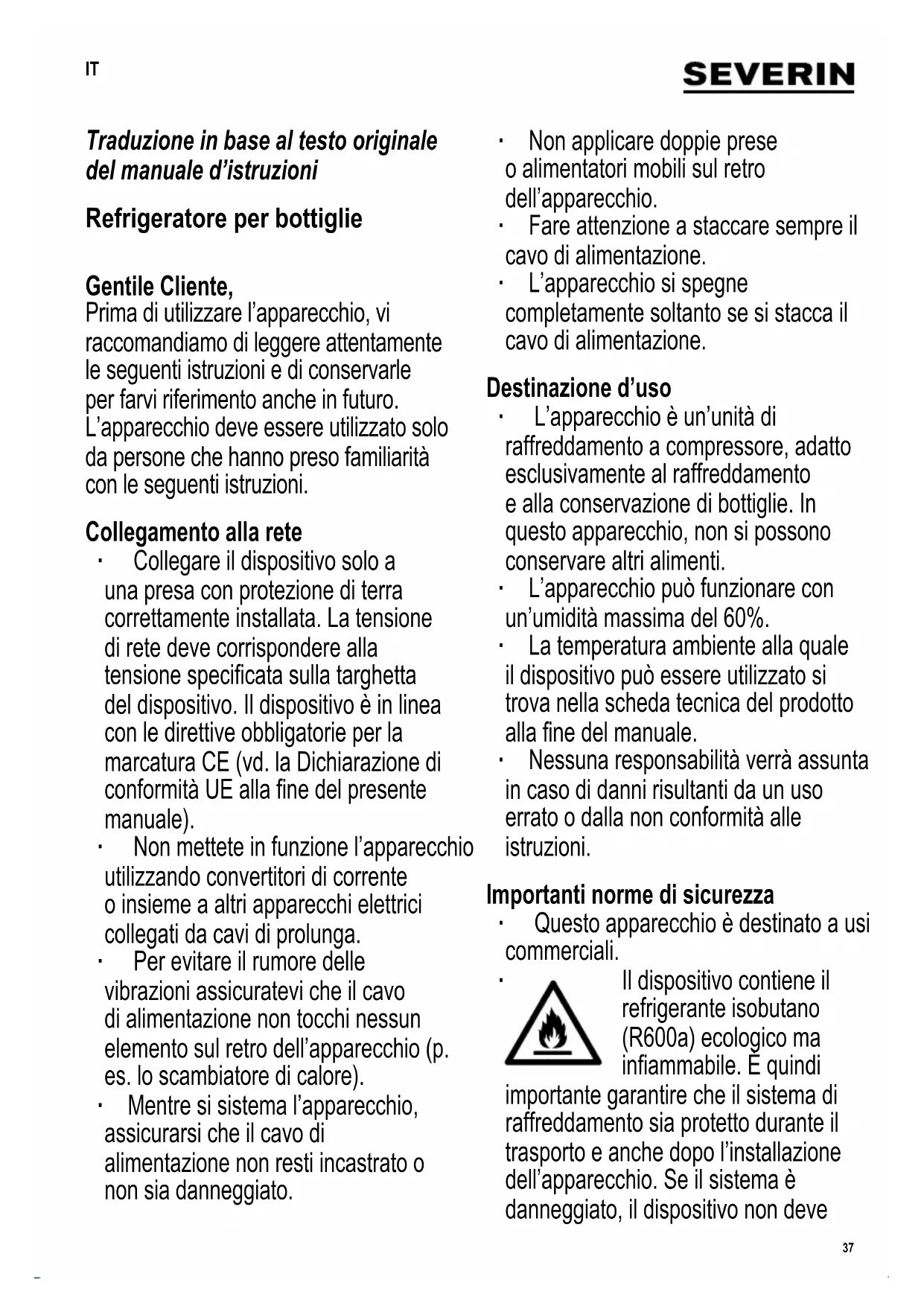 Volumen bruto (en dm3 o I) Condiciones ambientales apropiadas para el dispositivo (según la tabla 6) Temperatura máxima (°C) Humedad relativa (%) 237 +25 60 Parámetros generales del producto: Consumo energético anual (en kWh/a) 449 Temperatura(s) recomendada(s) para la conservación óptima de los alimentos (en °C) (Estos ajustes no deberán entrar en conicto con las condiciones de temperatura especicadas en las tablas 4, 5 y 6 del anexo IV) +5,0 EEI 34,9 Clase de eciencia energética C Parámetros de la fuente de iluminación Clase de fuente de iluminación LED Clase de eciencia energética - Duración mínima de la garantía ofrecida por el fabricante: 24 meses Otras informaciones: Enlace al sitio web del fabricante donde se puede encontrar la información establecida en el punto 3 del anexo II del Reglamento (UE) 2019/2024 de la Comisión: www.severin.de37 142 x 208 mm Traduzione in base al testo originale del manuale d’istruzioni Refrigeratore per bottiglie Gentile Cliente, Prima di utilizzare l’apparecchio, vi raccomandiamo di leggere attentamente le seguenti istruzioni e di conservarle per farvi riferimento anche in futuro. L’apparecchio deve essere utilizzato solo da persone che hanno preso familiarità con le seguenti istruzioni. Collegamento alla rete ∙ Collegare il dispositivo solo a una presa con protezione di terra correttamente installata. La tensione di rete deve corrispondere alla tensione specicata sulla targhetta del dispositivo. Il dispositivo è in linea con le direttive obbligatorie per la marcatura CE (vd. la Dichiarazione di conformità UE alla ne del presente manuale). ∙ Non mettete in funzione l’apparecchio utilizzando convertitori di corrente o insieme a altri apparecchi elettrici collegati da cavi di prolunga. ∙ Per evitare il rumore delle vibrazioni assicuratevi che il cavo di alimentazione non tocchi nessun elemento sul retro dell’apparecchio (p. es. lo scambiatore di calore). ∙ Mentre si sistema l’apparecchio, assicurarsi che il cavo di alimentazione non resti incastrato o non sia danneggiato. ∙ Non applicare doppie prese o alimentatori mobili sul retro dell’apparecchio. ∙ Fare attenzione a staccare sempre il cavo di alimentazione. ∙ L’apparecchio si spegne completamente soltanto se si stacca il cavo di alimentazione. Destinazione d’uso ∙ L’apparecchio è un’unità di raffreddamento a compressore, adatto esclusivamente al raffreddamento e alla conservazione di bottiglie. In questo apparecchio, non si possono conservare altri alimenti. ∙ L’apparecchio può funzionare con un’umidità massima del 60%. ∙ La temperatura ambiente alla quale il dispositivo può essere utilizzato si trova nella scheda tecnica del prodotto alla ne del manuale. ∙ Nessuna responsabilità verrà assunta in caso di danni risultanti da un uso errato o dalla non conformità alle istruzioni. Importanti norme di sicurezza ∙ Questo apparecchio è destinato a usi commerciali.
