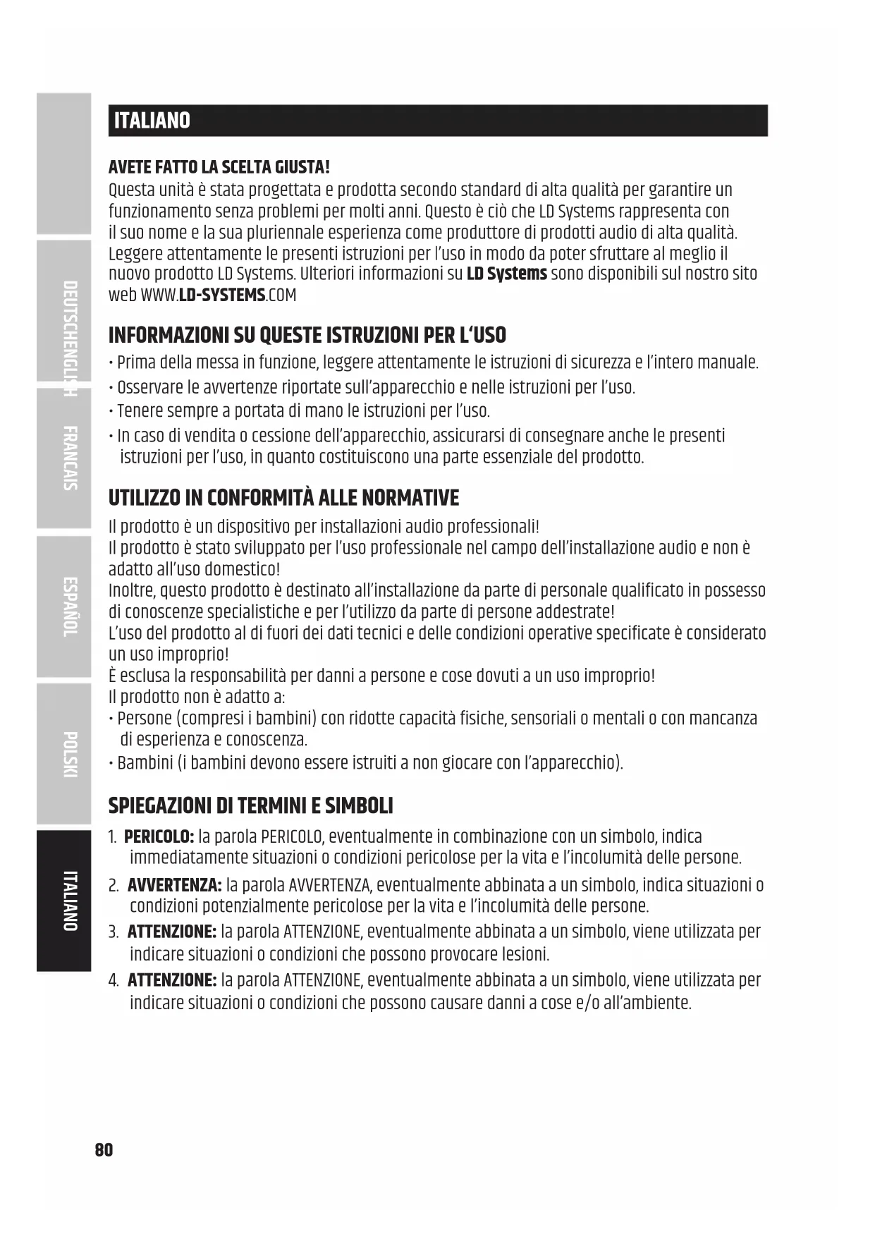 Deklaracje zgodności dla produktów objętych dyrektywami LVD, EMC i RoHS można zamówić na stronie info@adamhall.com. Deklaracje zgodności dla produktów podlegających dyrektywie RED, można uzyskać na stronie www.adamhall.com/compliance/. Pomyłki i błędy, jak również zmiany techniczne lub inne są zastrzeżone! DEUTSCHFRANCAIS ESPAÑOL ENGLISH ITALIANO POLSKI80 ITALIANO AVETE FATTO LA SCELTA GIUSTA! Questa unità è stata progettata e prodotta secondo standard di alta qualità per garantire un funzionamento senza problemi per molti anni. Questo è ciò che LD Systems rappresenta con il suo nome e la sua pluriennale esperienza come produttore di prodotti audio di alta qualità. Leggere attentamente le presenti istruzioni per l’uso in modo da poter sfruttare al meglio il nuovo prodotto LD Systems. Ulteriori informazioni su LD Systems sono disponibili sul nostro sito web WWW.LD-SYSTEMS.COM INFORMAZIONI SU QUESTE ISTRUZIONI PER L‘USO