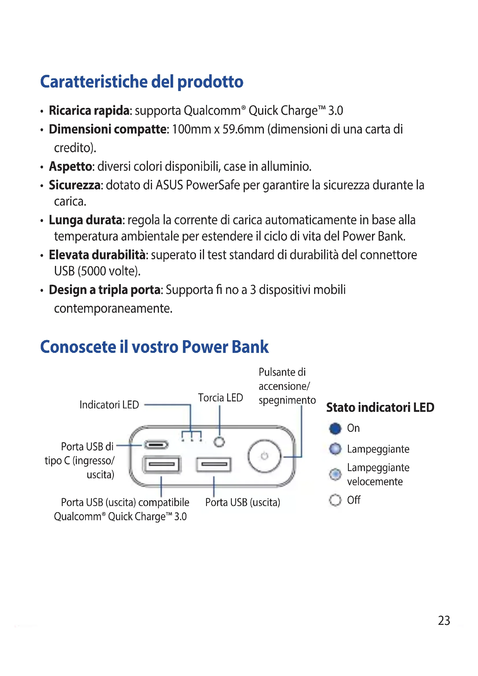 - Design a tripla porta: Supporta no a 3 dispositivi mobili contemporaneamente. Conoscete il vostro Power Bank Porta USB di tipo C (ingresso/ uscita) Porta USB (uscita) compatibile Qualcomm® Quick Charge™ 3.0 Porta USB (uscita) Indicatori LED Pulsante di accensione/ spegnimento Torcia LED Stato indicatori LED