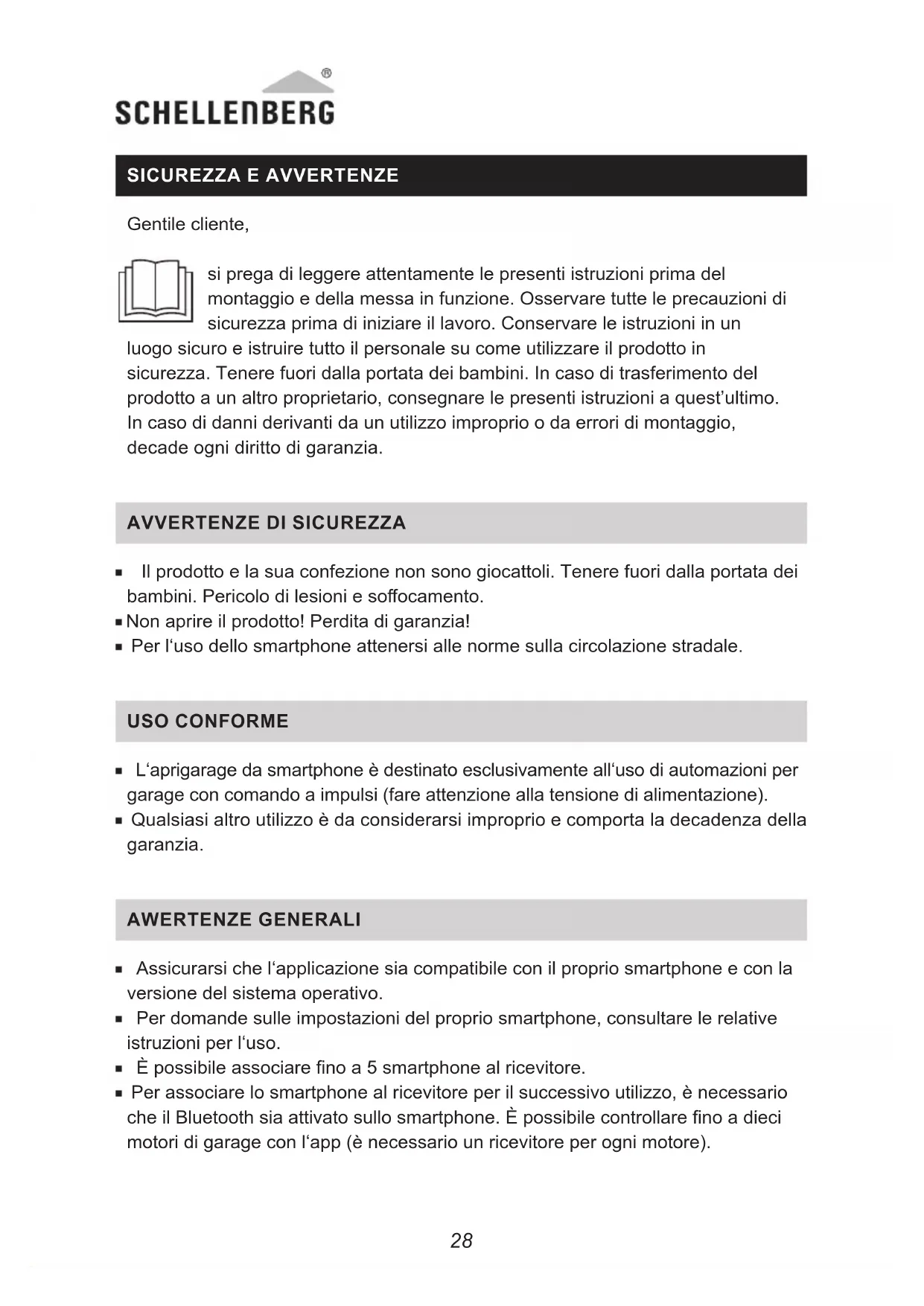 Il prodotto e la sua confezione non sono giocattoli Tenere fuori dalla portata dei bambini.Pericolodilesioniesoocamento. Nonaprireilprodotto!Perditadigaranzia! Per l‘uso dello smartphone attenersi alle norme sulla circolazione stradale USO CONFORME L‘aprigarage da smartphone è destinato esclusivamente all‘uso di automazioni per garage con comando a impulsi (fare attenzione alla tensione di alimentazione) Qualsiasi altro utilizzo è da considerarsi improprio e comporta la decadenza della garanzia AWERTENZE GENERALI Assicurarsi che l‘applicazione sia compatibile con il proprio smartphone e con la versione del sistema operativo Per domande sulle impostazioni del proprio smartphone, consultare le relative istruzioni per l‘uso Èpossibileassociarenoa5smartphonealricevitore. Per associare lo smartphone al ricevitore per il successivo utilizzo, è necessario cheilBluetoothsiaattivatosullosmartphone.Èpossibilecontrollarenoadieci motori di garage con l‘app (è necessario un ricevitore per ogni motore)2928