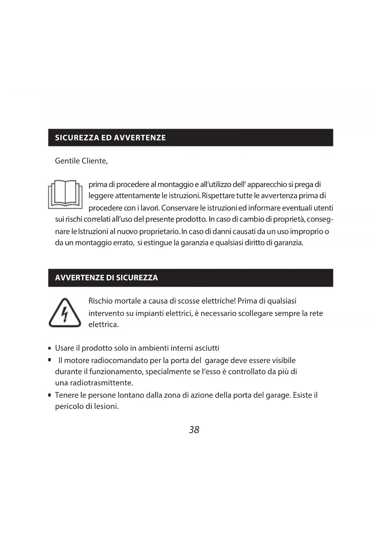Rischio mortale a causa di scosse elettriche! Prima di qualsiasi intervento su impianti elettrici, è necessario scollegare sempre la rete elettrica Usare il prodotto solo in ambienti interni asciutti Il motore radiocomandato per la porta del garage deve essere visibile durante il funzionamento, specialmente se l‘esso è controllato da più di una radiotrasmittente Tenere le persone lontano dalla zona di azione della porta del garage Esiste il pericolo di lesioni