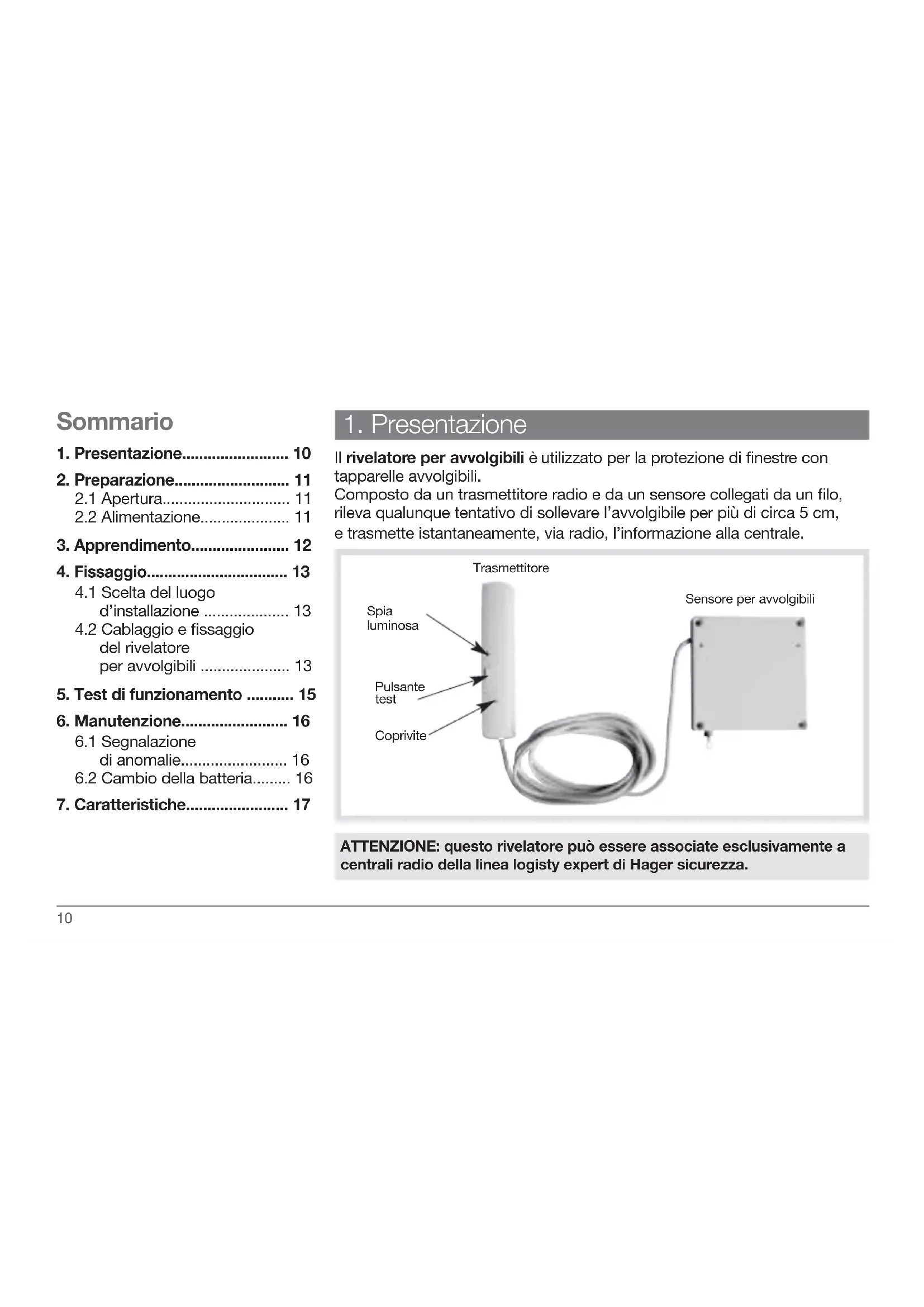 Il rivelatore per avvolgibili è utilizzato per la protezione di finestre con tapparelle avvolgibili. Composto da un trasmettitore radio e da un sensore collegati da un filo, rileva qualunque tentativo di sollevare l’avvolgibile per più di circa 5 cm, e trasmette istantaneamente, via radio, l’informazione alla centrale. ATTENZIONE: questo rivelatore può essere associate esclusivamente a centrali radio della linea logisty expert di Hager sicurezza. Sensore per avvolgibiliTrasmettitore Spia luminosaPulsante test Coprivite Sommario