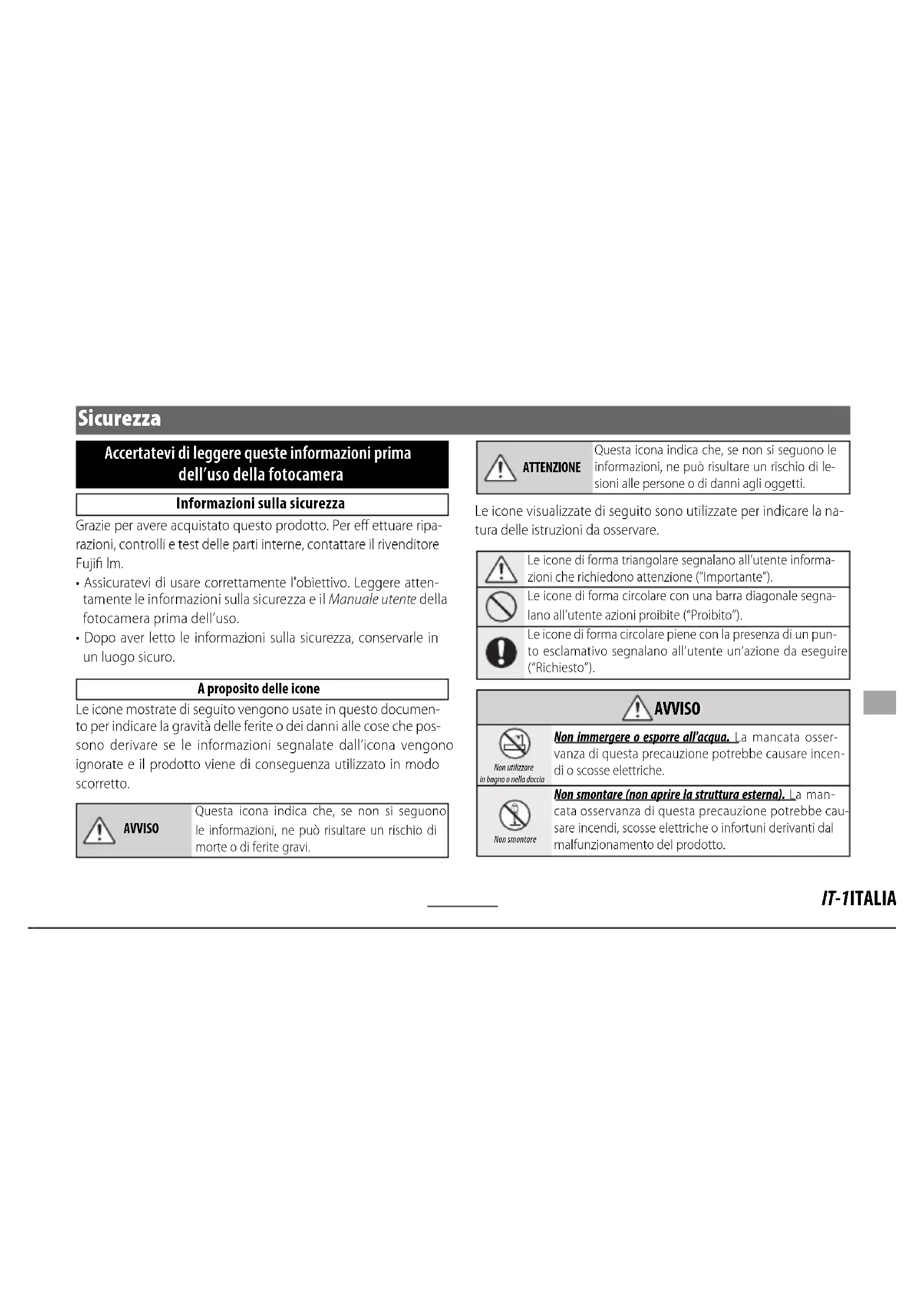 AVVISO AVVISO Non toccare i componenti interni Se la struttura esterna dovesse rompersi in seguito a una caduta o a un altro incidente, non toccare i componenti esposti. In caso non ci si attenga a questa precauzione, potrebbero verifi carsi scosse elettriche o infortuni de- rivanti dal contatto con le parti danneggiate. Rimuo- vere immediatamente la batteria della fotocamera, avendo cura di evitare infortuni o scosse elettriche, e portare il prodotto presso il punto vendita per una consulenza. Non appoggiare su super ci instabili. Il prodotto potreb- be cadere, causando lesioni personali. Non guardare il sole attraverso l'obiettivo o i mirini della fotocamera. La mancata osservanza di questa precau- zione può provocare danni permanenti alla vista.