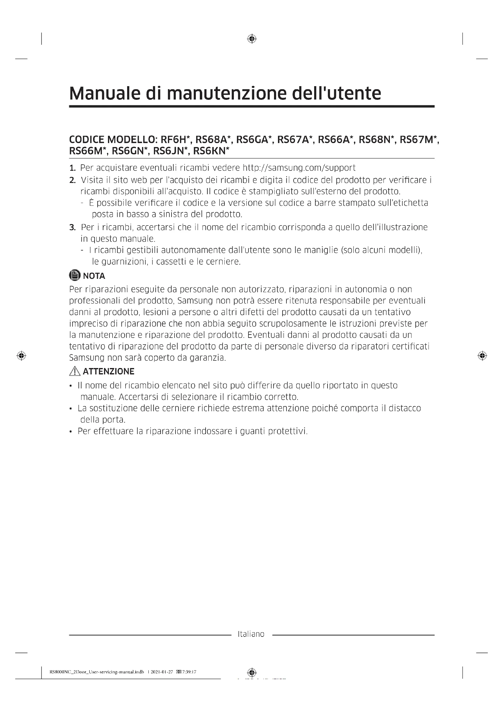 verdure/alimenti secchi. Per rimontare i cassetti Rimontare i cassetti seguendo l'ordine contrario seguito per la rimozione. RS8000NC_2Door_User-servicing-manual.indb 4 2021-01-27 7:39:18Italiano Sostituzione delle cerniere Per sostituire le cerniere, rimuovere prima la porta. ATTENZIONE