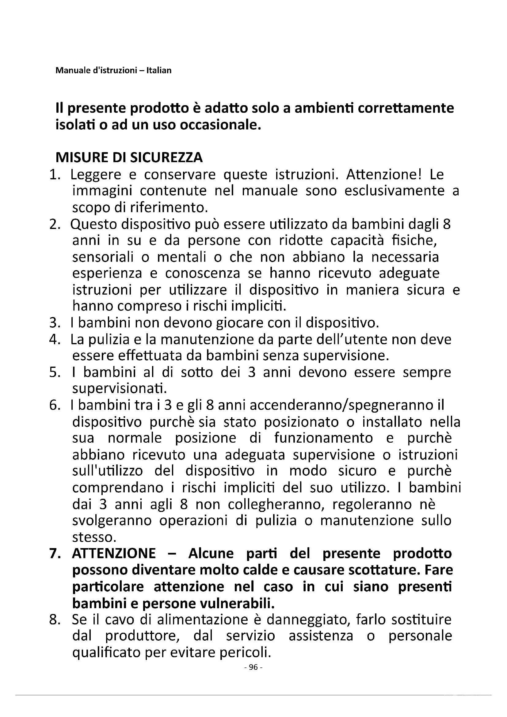 dispositivo purchè sia stato posizionato o installato nella sua normale posizione di funzionamento e purchè abbiano ricevuto una adeguata supervisione o istruzioni sull'utilizzo del dispositivo in modo sicuro e purchè comprendano i rischi impliciti del suo utilizzo. I bambini dai 3 anni agli 8 non collegheranno, regoleranno nè svolgeranno operazioni di pulizia o manutenzione sullo stesso.