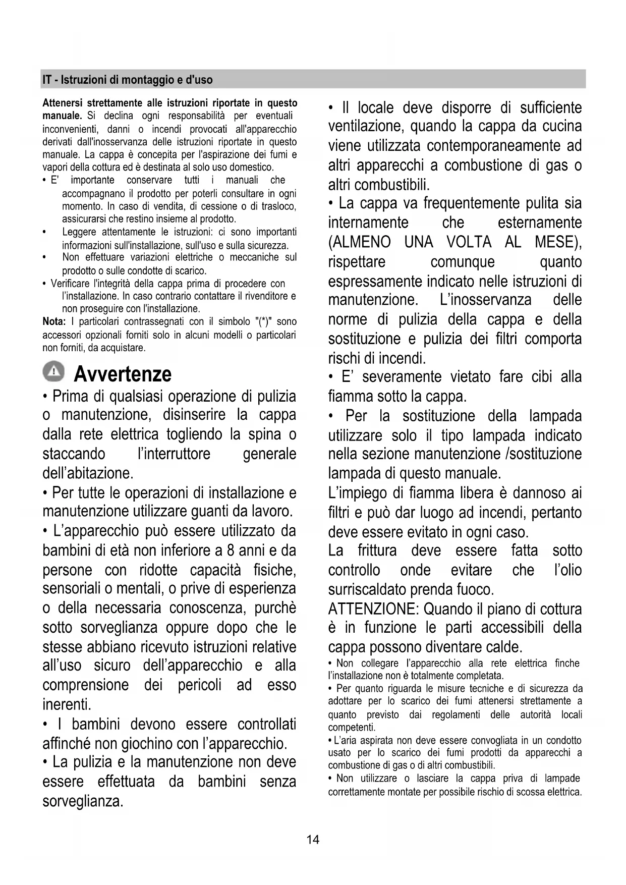 - Per la sostituzione della lampada utilizzare solo il tipo lampada indicato nella sezione manutenzione /sostituzione lampada di questo manuale. L’impiego di fiamma libera è dannoso ai filtri e può dar luogo ad incendi, pertanto deve essere evitato in ogni caso. La frittura deve essere fatta sotto controllo onde evitare che l’olio surriscaldato prenda fuoco. ATTENZIONE: Quando il piano di cottura è in funzione le parti accessibili della cappa possono diventare calde.