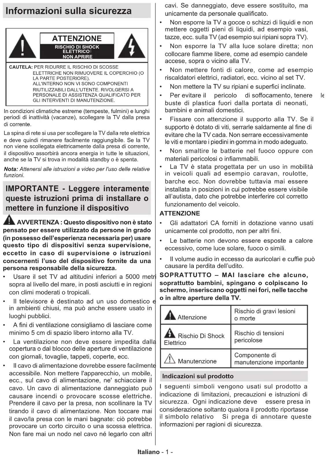 NON APRIRECAUTELA: PER RIDURRE IL RISCHIO DI SCOSSE ELETTRICHE NON RIMUOVERE IL COPERCHIO (O LA PARTE POSTERIORE). ALL'INTERNO NON VI SONO COMPONENTI RIUTILIZZABILI DALL'UTENTE. RIVOLGERSI A PERSONALE DI ASSISTENZA QUALIFICATO PER GLI INTERVENTI DI MANUTENZIONE.Nota: Attenersi alle istruzioni a video per l'uso delle relative funzioni.In condizioni climatiche estreme (tempeste, fulmini) e lunghi periodi di inattività (vacanze), scollegare la TV dalla presa di corrente.La spina di rete si usa per scollegare la TV dalla rete elettrica e deve quindi rimanere facilmente raggiungibile. Se la TV non viene scollegata elettricamente dalla presa di corrente, il dispositivo assorbirà ancora energia in tutte le situazioni, anche se la TV si trova in modalità standby o è spenta. IMPORTANTE - Leggere interamente queste istruzioni prima di installare o mettere in funzione il dispositivo AVVERTENZA : Questo dispositivo non è stato pensato per essere utilizzato da persone in grado (in possesso dell’esperienza necessaria per) usare questo tipo di dispositivi senza supervisione, eccetto in caso di supervisione o istruzioni concernenti l’uso del dispositivo fornite da una persona responsabile della sicurezza. Usare il set TV ad altitudini inferiori a 5000 metri sopra al livello del mare, in posti asciutti e in regioni con climi moderati o tropicali. Il televisore è destinato ad un uso domestico e in ambienti chiusi, ma può anche essere usato in luoghi pubblici.