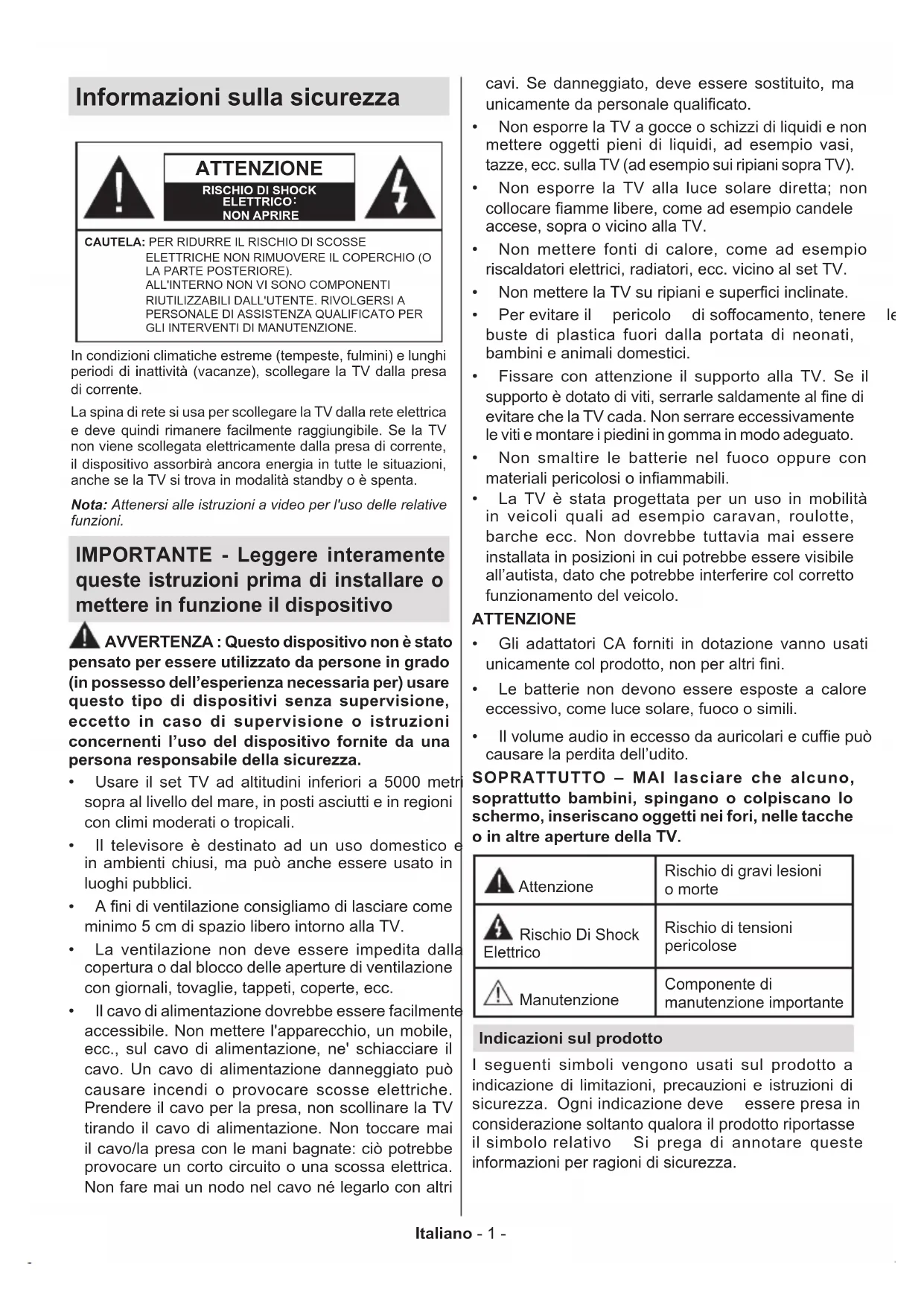NON APRIRECAUTELA: PER RIDURRE IL RISCHIO DI SCOSSE ELETTRICHE NON RIMUOVERE IL COPERCHIO (O LA PARTE POSTERIORE). ALL'INTERNO NON VI SONO COMPONENTI RIUTILIZZABILI DALL'UTENTE. RIVOLGERSI A PERSONALE DI ASSISTENZA QUALIFICATO PER GLI INTERVENTI DI MANUTENZIONE.Nota: Attenersi alle istruzioni a video per l'uso delle relative funzioni.In condizioni climatiche estreme (tempeste, fulmini) e lunghi periodi di inattività (vacanze), scollegare la TV dalla presa di corrente.La spina di rete si usa per scollegare la TV dalla rete elettrica e deve quindi rimanere facilmente raggiungibile. Se la TV non viene scollegata elettricamente dalla presa di corrente, il dispositivo assorbirà ancora energia in tutte le situazioni, anche se la TV si trova in modalità standby o è spenta. IMPORTANTE - Leggere interamente queste istruzioni prima di installare o mettere in funzione il dispositivo AVVERTENZA : Questo dispositivo non è stato pensato per essere utilizzato da persone in grado (in possesso dell’esperienza necessaria per) usare questo tipo di dispositivi senza supervisione, eccetto in caso di supervisione o istruzioni concernenti l’uso del dispositivo fornite da una persona responsabile della sicurezza. Usare il set TV ad altitudini inferiori a 5000 metri sopra al livello del mare, in posti asciutti e in regioni con climi moderati o tropicali. Il televisore è destinato ad un uso domestico e in ambienti chiusi, ma può anche essere usato in luoghi pubblici.