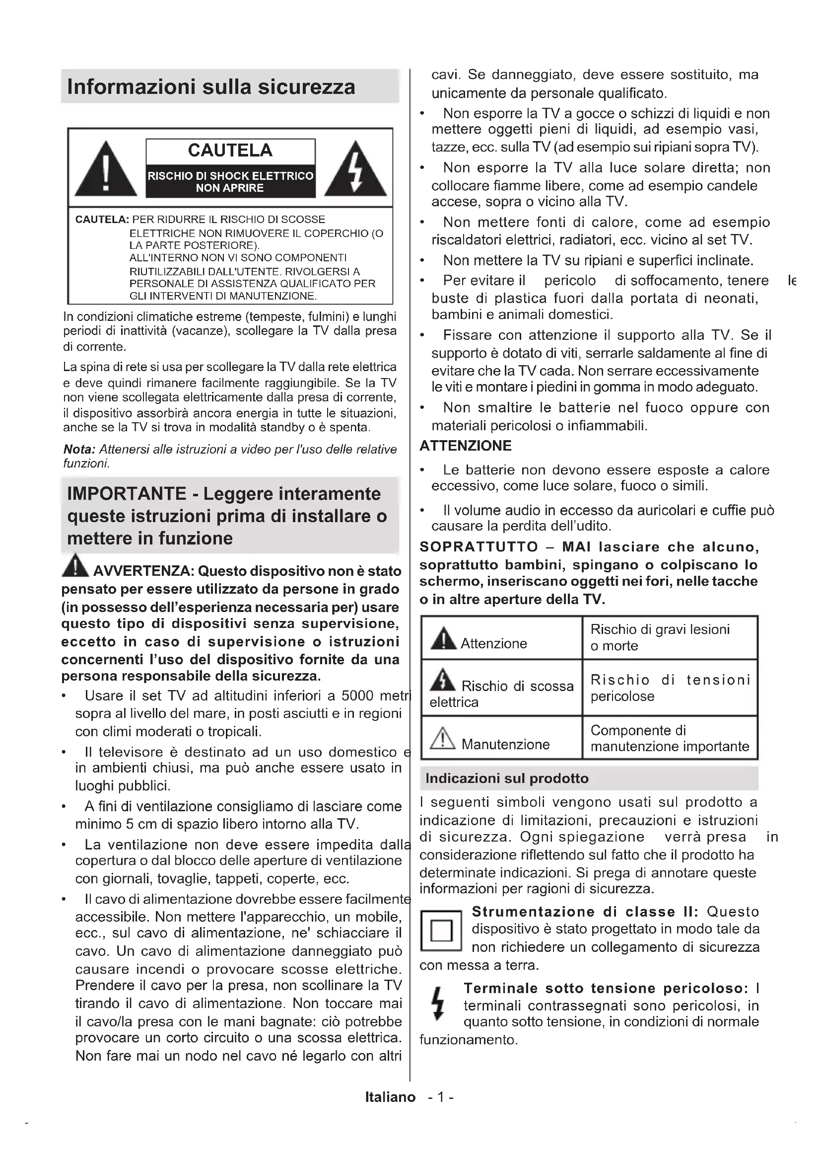 (**)Dependendo do modeloItaliano - 1 - Informazioni sulla sicurezza CAUTELA RISCHIO DI SHOCK ELETTRICONON APRIRECAUTELA: PER RIDURRE IL RISCHIO DI SCOSSE ELETTRICHE NON RIMUOVERE IL COPERCHIO (O LA PARTE POSTERIORE). ALL'INTERNO NON VI SONO COMPONENTI RIUTILIZZABILI DALL'UTENTE. RIVOLGERSI A PERSONALE DI ASSISTENZA QUALIFICATO PER GLI INTERVENTI DI MANUTENZIONE.Nota: Attenersi alle istruzioni a video per l'uso delle relative funzioni.In condizioni climatiche estreme (tempeste, fulmini) e lunghi periodi di inattività (vacanze), scollegare la TV dalla presa di corrente.La spina di rete si usa per scollegare la TV dalla rete elettrica e deve quindi rimanere facilmente raggiungibile. Se la TV non viene scollegata elettricamente dalla presa di corrente, il dispositivo assorbirà ancora energia in tutte le situazioni, anche se la TV si trova in modalità standby o è spenta. IMPORTANTE - Leggere interamente queste istruzioni prima di installare o mettere in funzione AVVERTENZA: Questo dispositivo non è stato pensato per essere utilizzato da persone in grado (in possesso dell’esperienza necessaria per) usare questo tipo di dispositivi senza supervisione, eccetto in caso di supervisione o istruzioni concernenti l’uso del dispositivo fornite da una persona responsabile della sicurezza. Usare il set TV ad altitudini inferiori a 5000 metri sopra al livello del mare, in posti asciutti e in regioni con climi moderati o tropicali. Il televisore è destinato ad un uso domestico e in ambienti chiusi, ma può anche essere usato in luoghi pubblici.