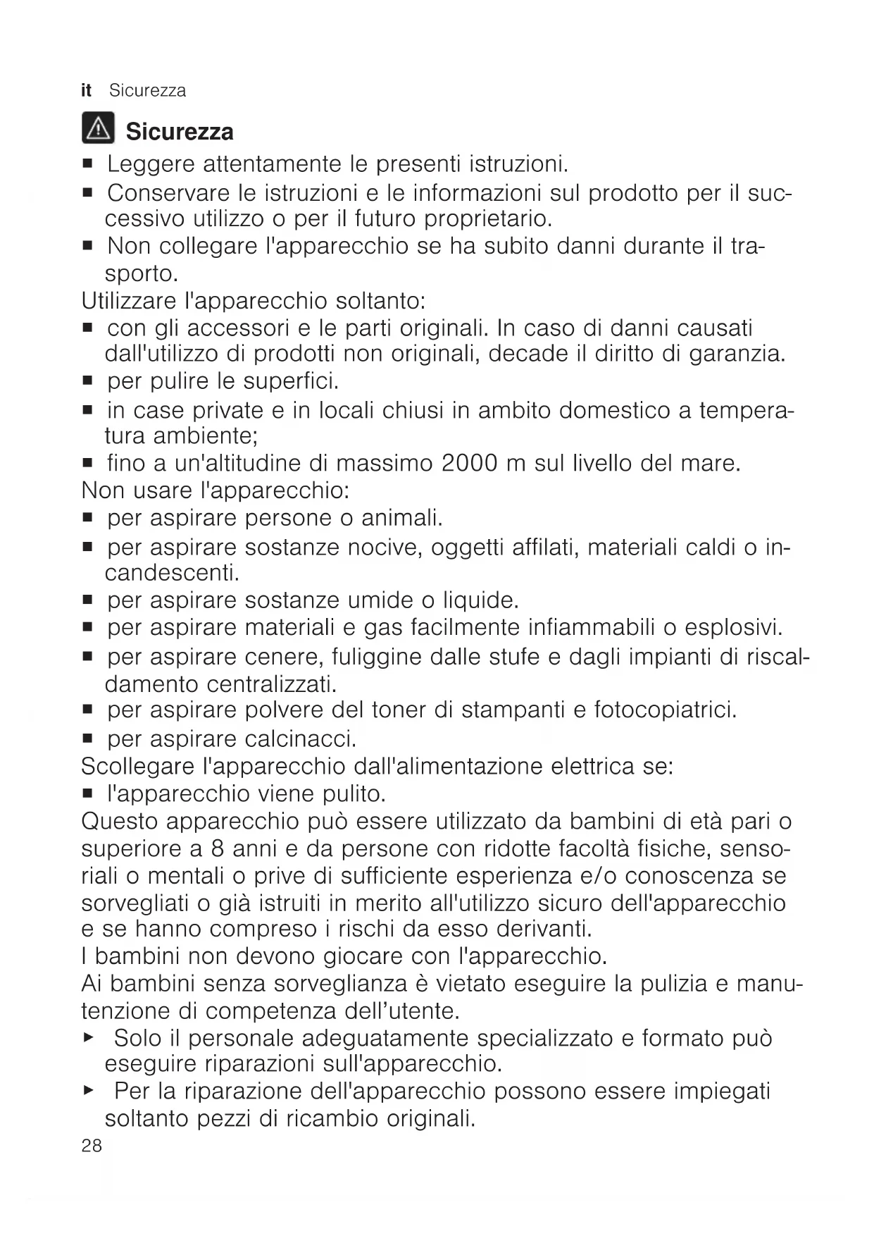 Sicurezza ¡ Leggere attentamente le presenti istruzioni. ¡ Conservare le istruzioni e le informazioni sul prodotto per il suc- cessivo utilizzo o per il futuro proprietario. ¡ Non collegare l'apparecchio se ha subito danni durante il tra- sporto. Utilizzare l'apparecchio soltanto: ¡ con gli accessori e le parti originali. In caso di danni causati dall'utilizzo di prodotti non originali, decade il diritto di garanzia. ¡ per pulire le superfici. ¡ in case private e in locali chiusi in ambito domestico a tempera- tura ambiente; ¡ fino a un'altitudine di massimo 2000m sul livello del mare. Non usare l'apparecchio: ¡ per aspirare persone o animali. ¡ per aspirare sostanze nocive, oggetti affilati, materiali caldi o in- candescenti. ¡ per aspirare sostanze umide o liquide. ¡ per aspirare materiali e gas facilmente infiammabili o esplosivi. ¡ per aspirare cenere, fuliggine dalle stufe e dagli impianti di riscal- damento centralizzati. ¡ per aspirare polvere del toner di stampanti e fotocopiatrici. ¡ per aspirare calcinacci. Scollegare l'apparecchio dall'alimentazione elettrica se: ¡ l'apparecchio viene pulito. Questo apparecchio può essere utilizzato da bambini di età pari o superiore a 8 anni e da persone con ridotte facoltà fisiche, senso- riali o mentali o prive di sufficiente esperienza e/o conoscenza se sorvegliati o già istruiti in merito all'utilizzo sicuro dell'apparecchio e se hanno compreso i rischi da esso derivanti. I bambini non devono giocare con l'apparecchio. Ai bambini senza sorveglianza è vietato eseguire la pulizia e manu- tenzione di competenza dell’utente. ▶ Solo il personale adeguatamente specializzato e formato può eseguire riparazioni sull'apparecchio. ▶ Per la riparazione dell'apparecchio possono essere impiegati soltanto pezzi di ricambio originali.Sicurezza it