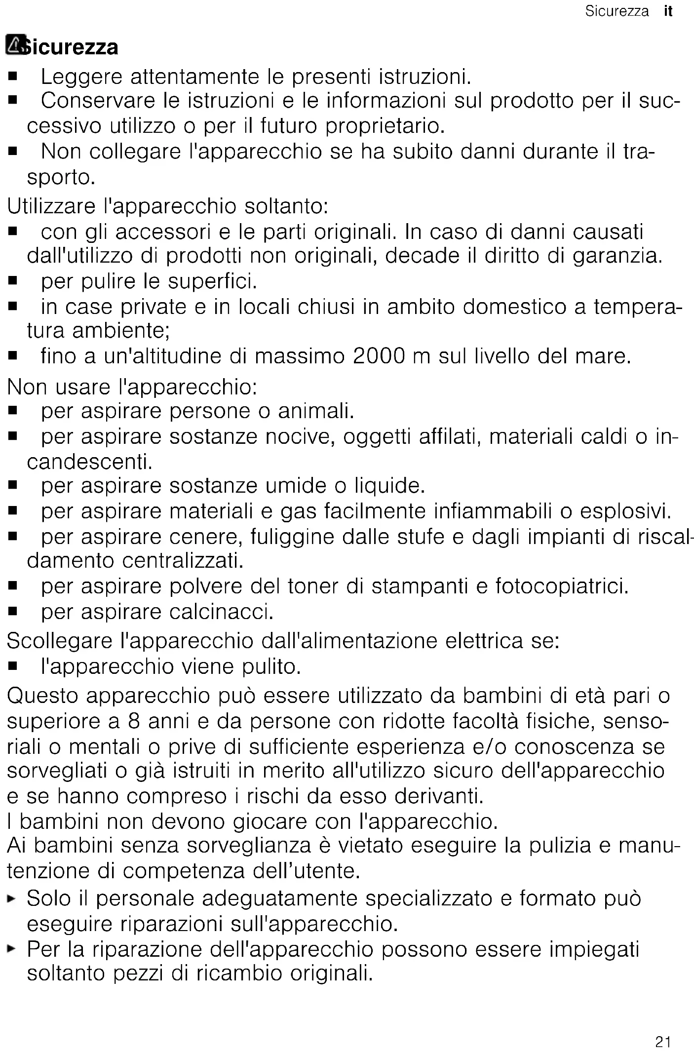 Selon l'équipement de l'appareil 19fr Informations liées à la directive sur l'écoconception dans les notices d'utilisation et les docu- ments complémentaires. Informations liées à la directive sur l'écoconceptionInformations liées à la directive sur l'écoconception Cet aspirateur est un aspirateur ménager classé comme un aspirateur à usage géné- ral. Pour nettoyer les tapis, utilisez la brosse universelle adaptable. Pour nettoyer les sols durs, utilisez la brosse pour sols durs prévue pour le net- toyage des sols durs et des fentes d'essai, dans la mesure où celle-ci est fournie. Les données de performance de cet appa- reil sont basées sur les méthodes de me- sure et de calcul conformes à la directive (UE) N°666/2013 et aux normes EN60312-1, EN60704-2-1, EN60335-2-2. 20Sicurezza it Sicurezza Sicurezza ¡ Leggere attentamente le presenti istruzioni. ¡ Conservare le istruzioni e le informazioni sul prodotto per il suc- cessivo utilizzo o per il futuro proprietario. ¡ Non collegare l'apparecchio se ha subito danni durante il tra- sporto. Utilizzare l'apparecchio soltanto: ¡ con gli accessori e le parti originali. In caso di danni causati dall'utilizzo di prodotti non originali, decade il diritto di garanzia. ¡ per pulire le superfici. ¡ in case private e in locali chiusi in ambito domestico a tempera- tura ambiente; ¡ fino a un'altitudine di massimo 2000m sul livello del mare. Non usare l'apparecchio: ¡ per aspirare persone o animali. ¡ per aspirare sostanze nocive, oggetti affilati, materiali caldi o in- candescenti. ¡ per aspirare sostanze umide o liquide. ¡ per aspirare materiali e gas facilmente infiammabili o esplosivi. ¡ per aspirare cenere, fuliggine dalle stufe e dagli impianti di riscal- damento centralizzati. ¡ per aspirare polvere del toner di stampanti e fotocopiatrici. ¡ per aspirare calcinacci. Scollegare l'apparecchio dall'alimentazione elettrica se: ¡ l'apparecchio viene pulito. Questo apparecchio può essere utilizzato da bambini di età pari o superiore a 8 anni e da persone con ridotte facoltà fisiche, senso- riali o mentali o prive di sufficiente esperienza e/o conoscenza se sorvegliati o già istruiti in merito all'utilizzo sicuro dell'apparecchio e se hanno compreso i rischi da esso derivanti. I bambini non devono giocare con l'apparecchio. Ai bambini senza sorveglianza è vietato eseguire la pulizia e manu- tenzione di competenza dell’utente. Solo il personale adeguatamente specializzato e formato può eseguire riparazioni sull'apparecchio. Per la riparazione dell'apparecchio possono essere impiegati soltanto pezzi di ricambio originali. 21it Sicurezza Al fine di evitare pericoli, se il cavo di alimentazione di questo apparecchio subisce danni deve essere sostituito dal produttore, dal suo servizio di assistenza clienti o da persona in possesso di simile qualifica. Non mettere mai in funzione un apparecchio danneggiato. Non utilizzare mai un apparecchio con la superficie danneggiata. Non tirare mai il cavo di collegamento alla rete elettrica per stac- care l'apparecchio dalla rete elettrica. Staccare sempre la spina del cavo di alimentazione. Non tirare o reggere mai l'apparecchio dal cavo di alimentazio- ne. Se l'apparecchio o il cavo di alimentazione è danneggiato, stac- care subito la spina di alimentazione del cavo di alimentazione e spegnere il fusibile nella scatola dei fusibili. Rivolgersi al servizio di assistenza clienti.