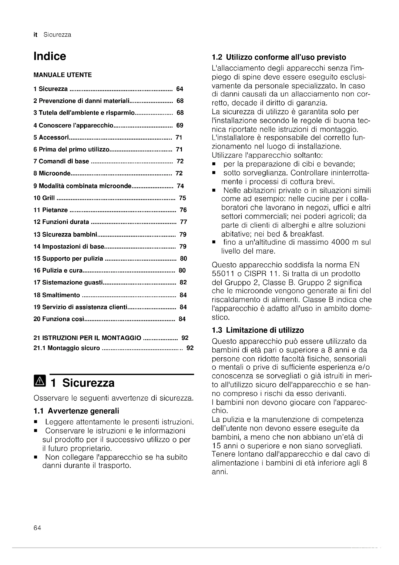 1 Sicurezza Osservare le seguenti avvertenze di sicurezza. 1.1 Avvertenze generali ¡ Leggere attentamente le presenti istruzioni. ¡ Conservare le istruzioni e le informazioni sul prodotto per il successivo utilizzo o per il futuro proprietario. ¡ Non collegare l'apparecchio se ha subito danni durante il trasporto. 1.2 Utilizzo conforme all'uso previsto L'allacciamento degli apparecchi senza l'im- piego di spine deve essere eseguito esclusi- vamente da personale specializzato. In caso di danni causati da un allacciamento non cor- retto, decade il diritto di garanzia. La sicurezza di utilizzo è garantita solo per l'installazione secondo le regole di buona tec- nica riportate nelle istruzioni di montaggio. L'installatore è responsabile del corretto fun- zionamento nel luogo di installazione. Utilizzare l'apparecchio soltanto: ¡ per la preparazione di cibi e bevande; ¡ sotto sorveglianza. Controllare ininterrotta- mente i processi di cottura brevi. ¡ Nelle abitazioni private o in situazioni simili come ad esempio: nelle cucine per i colla- boratori che lavorano in negozi, uffici e altri settori commerciali; nei poderi agricoli; da parte di clienti di alberghi e altre soluzioni abitative; nei bed & breakfast. ¡ fino a un'altitudine di massimo 4000m sul livello del mare. Questo apparecchio soddisfa la norma EN 55011 o CISPR 11. Si tratta di un prodotto del Gruppo 2, Classe B. Gruppo 2 significa che le microonde vengono generate ai fini del riscaldamento di alimenti. Classe B indica che l'apparecchio è adatto all'uso in ambito dome- stico. 1.3 Limitazione di utilizzo Questo apparecchio può essere utilizzato da bambini di età pari o superiore a 8 anni e da persone con ridotte facoltà fisiche, sensoriali o mentali o prive di sufficiente esperienza e/o conoscenza se sorvegliati o già istruiti in meri- to all'utilizzo sicuro dell'apparecchio e se han- no compreso i rischi da esso derivanti. I bambini non devono giocare con l'apparec- chio. La pulizia e la manutenzione di competenza dell’utente non devono essere eseguite da bambini, a meno che non abbiano un’età di 15 anni o superiore e non siano sorvegliati. Tenere lontano dall'apparecchio e dal cavo di alimentazione i bambini di età inferiore agli 8 anni.Sicurezza it