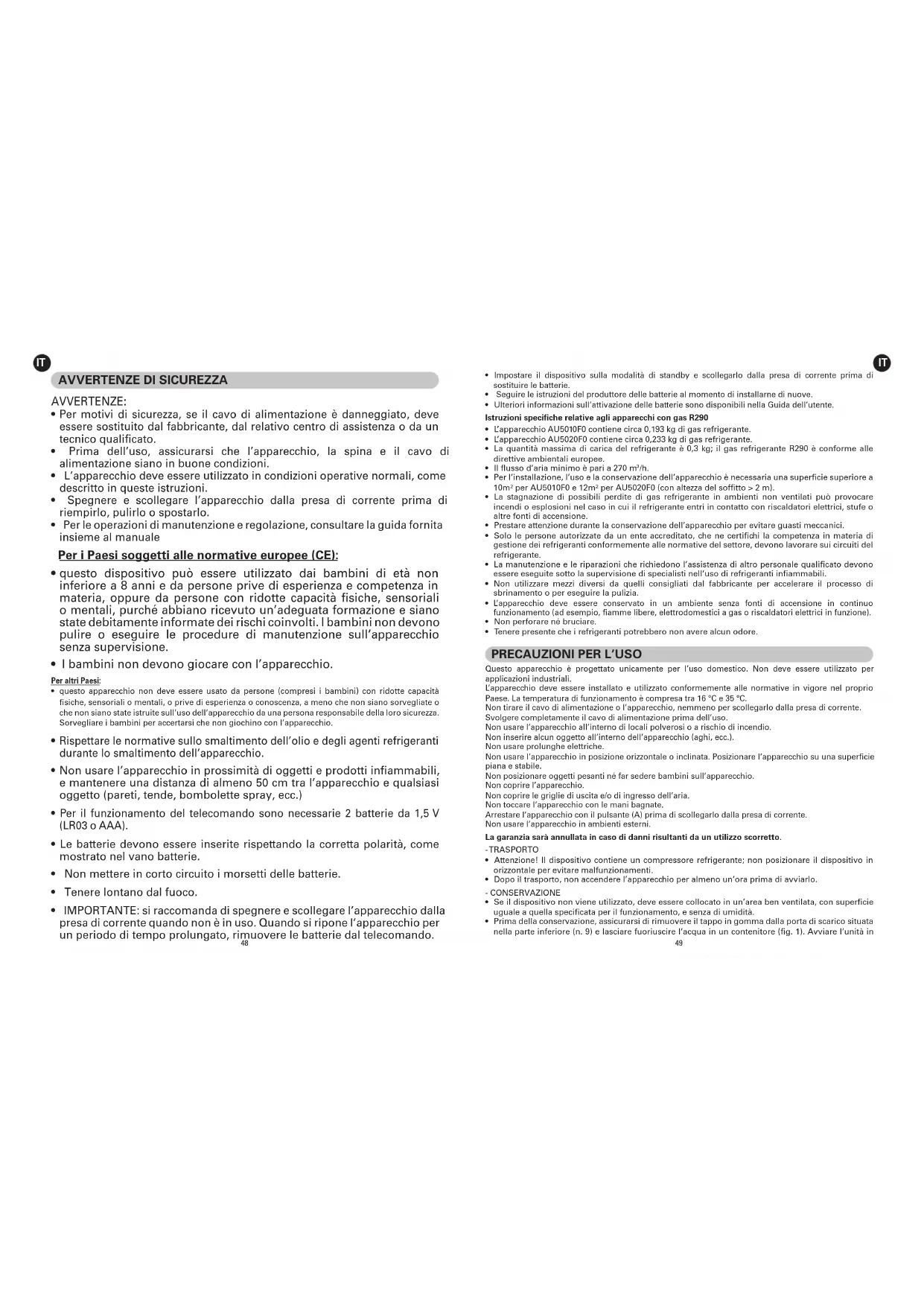 - Per l’installazione, l’uso e la conservazione dell’apparecchio è necessaria una superficie superiore a 10m² per AU5010F0 e 12m² per AU5020F0 (con altezza del soffitto > 2 m).
