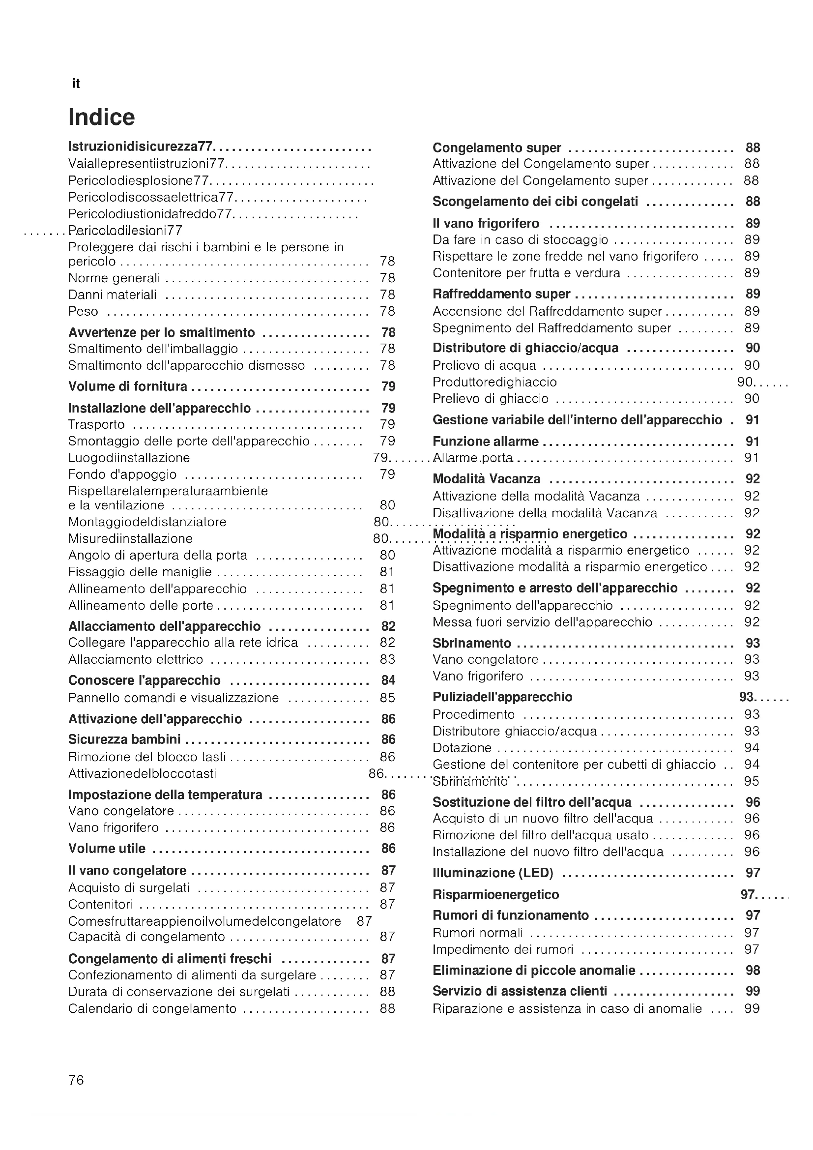 Indice Istruzioni di sicurezza 77......................... Vai alle presenti istruzioni 77....................... Pericolo di esplosione 77.......................... Pericolo di scossa elettrica 77..................... Pericolo di ustioni da freddo 77.................... Pericolo di lesioni 77.............................. Proteggeredairischiibambinielepersonein pericolo 78....................................... Norme generali 78................................ Danni materiali 78................................ Peso 78......................................... Avvertenze per lo smaltimento 78................. Smaltimento dell'imballaggio 78.................... Smaltimento dell'apparecchio dismesso 78......... Volume di fornitura 79............................ Installazione dell'apparecchio 79.................. Trasporto 79.................................... Smontaggio delle porte dell'apparecchio 79........ Luogo di installazione 79......................... Fondo d'appoggio 79............................ Rispettare la temperatura ambiente e la ventilazione 80.............................. Montaggio del distanziatore 80.................... Misure di installazione 80......................... Angolo di apertura della porta 80................. Fissaggio delle maniglie 81....................... Allineamento dell'apparecchio 81................. Allineamento delle porte 81....................... Allacciamento dell'apparecchio 82................ Collegare l'apparecchio alla rete idrica 82.......... Allacciamento elettrico 83......................... Conoscere l'apparecchio 84...................... Pannello comandi e visualizzazione 85............. Attivazione dell'apparecchio 86................... Sicurezza bambini 86............................. Rimozione del blocco tasti 86...................... Attivazione del blocco tasti 86..................... Impostazione della temperatura 86................ Vano congelatore 86.............................. Vano frigorifero 86................................ Volume utile 86.................................. Il vano congelatore 87............................ Acquisto di surgelati 87........................... Contenitori 87.................................... Come sfruttare appieno il volume del congelatore 87 Capacità di congelamento 87...................... Congelamento di alimenti freschi 87.............. Confezionamento di alimenti da surgelare 87........ Durata di conservazione dei surgelati 88............ Calendario di congelamento 88.................... Congelamento super 88.......................... Attivazione del Congelamento super 88.............