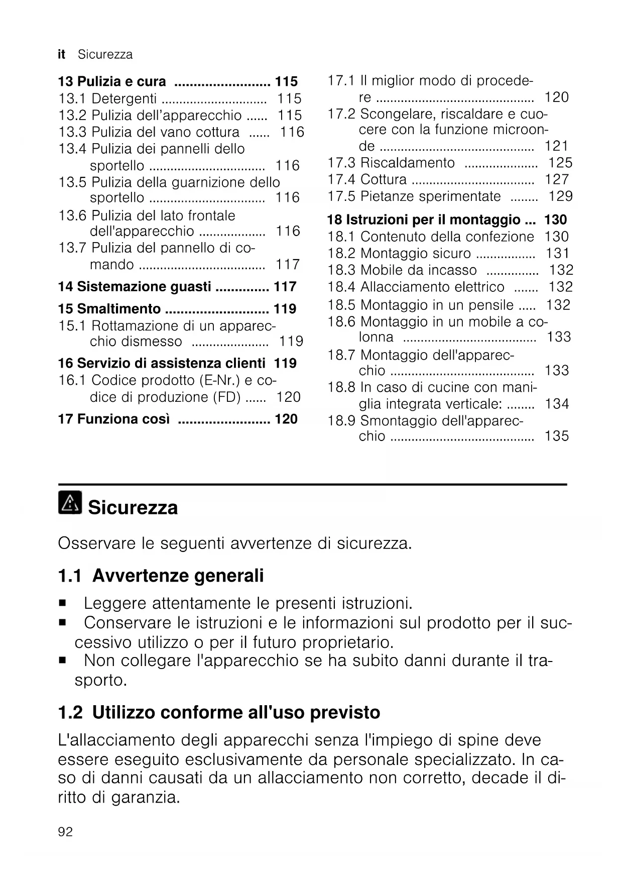 chio ......................................... 135 Sicurezza 1 Sicurezza Osservare le seguenti avvertenze di sicurezza. 1.1 Avvertenze generali ¡ Leggere attentamente le presenti istruzioni. ¡ Conservare le istruzioni e le informazioni sul prodotto per il suc- cessivo utilizzo o per il futuro proprietario. ¡ Non collegare l'apparecchio se ha subito danni durante il tra- sporto. 1.2 Utilizzo conforme all'uso previsto L'allacciamento degli apparecchi senza l'impiego di spine deve essere eseguito esclusivamente da personale specializzato. In ca- so di danni causati da un allacciamento non corretto, decade il di- ritto di garanzia. 92Sicurezza it La sicurezza di utilizzo è garantita solo per l'installazione secondo le regole di buona tecnica riportate nelle istruzioni di montaggio. L'installatore è responsabile del corretto funzionamento nel luogo di installazione. Utilizzare l'apparecchio soltanto: ¡ per la preparazione di cibi e bevande; ¡ sotto sorveglianza. Controllare ininterrottamente i processi di cottura brevi. ¡ Nelle abitazioni private o in situazioni simili come ad esempio: nelle cucine per i collaboratori che lavorano in negozi, uffici e altri settori commerciali; nei poderi agricoli; da parte di clienti di alberghi e altre soluzioni abitative; nei bed & breakfast. ¡ fino a un'altitudine di massimo 4000m sul livello del mare. Questo apparecchio soddisfa la norma EN 55011 o CISPR 11. Si tratta di un prodotto del Gruppo 2, Classe B. Gruppo 2 significa che le microonde vengono generate ai fini del riscaldamento di alimenti. Classe B indica che l'apparecchio è adatto all'uso in am- bito domestico. 1.3 Limitazione di utilizzo Questo apparecchio può essere utilizzato da bambini di età pari o superiore a 8 anni e da persone con ridotte facoltà fisiche, senso- riali o mentali o prive di sufficiente esperienza e/o conoscenza se sorvegliati o già istruiti in merito all'utilizzo sicuro dell'apparecchio e se hanno compreso i rischi da esso derivanti. I bambini non devono giocare con l'apparecchio. La pulizia e la manutenzione di competenza dell’utente non devo- no essere eseguite da bambini, a meno che non abbiano un’età di 15 anni o superiore e non siano sorvegliati. Tenere lontano dall'apparecchio e dal cavo di alimentazione i bambini di età inferiore agli 8 anni. 1.4 Utilizzo sicuro Inserire sempre correttamente gli accessori nel vano di cottura. AVVERTENZA‒Pericolo di incendio! Gli oggetti infiammabili depositati nel vano cottura possono incen- diarsi. Non riporre mai oggetti infiammabili all'interno del vano cottura. 93it Sicurezza Se si riscontra del fumo, spegnere l'apparecchio o staccare la presa e mantenere lo sportello chiuso per soffocare le fiamme eventualmente presenti. I residui di cibo, il grasso e il sugo dell'arrosto possono prendere fuoco. Prima di utilizzare l'apparecchio, eliminare lo sporco più grosso- lano dal vano cottura, dagli elementi riscaldanti e dagli accesso- ri. AVVERTENZA‒Pericolo di ustioni! L'accessorio o la stoviglia si surriscalda. Servirsi sempre delle presine per estrarre le stoviglie e gli ac- cessori caldi dal vano di cottura. I vapori dell'alcol nel vano cottura caldo potrebbero prendere fuo- co. Lo sportello dell'apparecchio può saltare in aria. Potrebbero fuoriuscire vapori molto caldi o fiammate. Utilizzare esclusivamente piccole quantità di bevande ad alta gradazione alcolica nelle pietanze. Non riscaldare gli alcolici (≥ 15 % vol.) allo stato non diluito (ad esempio per versarli sopra le pietanze). Aprire con cautela lo sportello dell'apparecchio. AVVERTENZA‒Pericolo di scottature! Durante il funzionamento le parti scoperte diventano molto calde. Non toccare mai le parti roventi. Tenere lontano i bambini. Aprendo lo sportello dell'apparecchio potrebbe fuoriuscire del va- pore caldo. A certe temperature il vapore non è visibile. Aprire con cautela lo sportello dell'apparecchio. Tenere lontano i bambini. La presenza di acqua nel vano di cottura caldo può causare la formazione di vapore. Non versare mai acqua nel vano cottura caldo. AVVERTENZA‒Pericolo di lesioni! Il vetro graffiato dello sportello dell'apparecchio potrebbe romper- si. Non utilizzare alcun detergente abrasivo né raschietti in metallo taglienti per la pulizia del vetro dello sportello dell'apparecchio, poiché possono graffiare la superficie. 94Sicurezza it Aprendo e chiudendo lo sportello dell'apparecchio le cerniere si muovono e possono bloccarsi. Non toccare mai la zona delle cerniere. AVVERTENZA‒Pericolo di scosse elettriche! Gli interventi di riparazione effettuati in modo non appropriato rap- presentano una fonte di pericolo. Solo il personale adeguatamente specializzato e formato può eseguire riparazioni sull'apparecchio. Per la riparazione dell'apparecchio possono essere impiegati soltanto pezzi di ricambio originali. Se il cavo di collegamento alla rete o quello dell'apparecchio viene danneggiato, deve essere sostituito con un apposito cavo di collegamento speciale, reperibile presso il produttore o il re- lativo servizio di assistenza clienti. Se il cavo di collegamento dell'apparecchio è danneggiato, de- ve essere sostituito da personale tecnico appositamente forma- to. Un isolamento danneggiato del cavo di allacciamento alla rete co- stituisce un pericolo. Non mettere mai il cavo di allacciamento alla rete a contatto con fonti di calore o parti dell'apparecchio calde. Non mettere mai il cavo di allacciamento alla rete a contatto con spigoli vivi. Non piegare, schiacciare o modificare mai il cavo di allaccia- mento alla rete. L'infiltrazione di umidità può provocare una scarica elettrica. Non lavare l'apparecchio con pulitori a vapore o idropulitrici. Un apparecchio o un cavo di alimentazione danneggiati costitui- scono un pericolo. Non azionare mai un apparecchio danneggiato. Non utilizzare mai un apparecchio con la superficie danneggia- ta. Non tirare mai il cavo di collegamento alla rete elettrica per staccare l'apparecchio dall