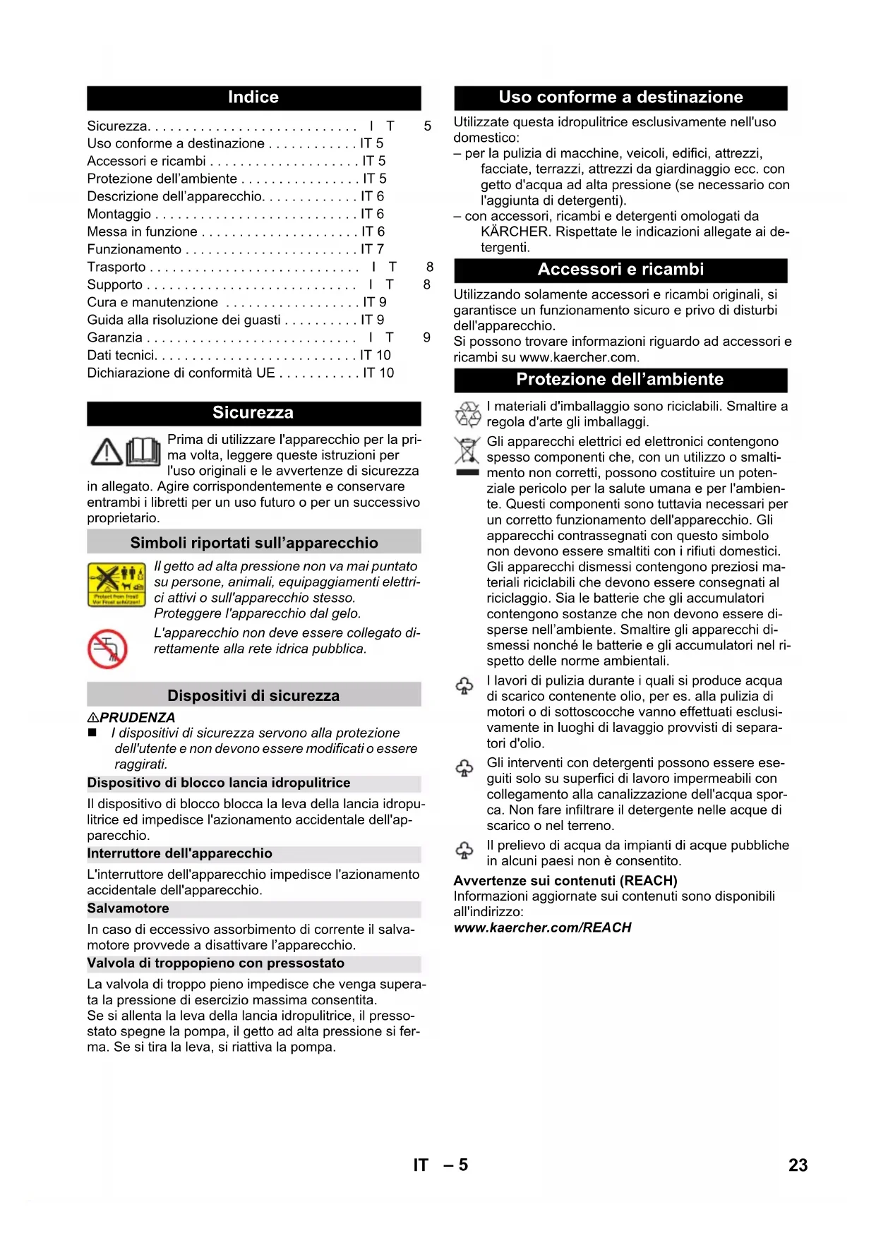 95 dB(A) Motif d’exemption conformément au règlement (UE) 2019/1781, annexe I, section 2, point 12) : j) Sous réserve de modifications techniques. Déclaration UE de conformité Produit : Nettoyeur haute pression Type : K 6 Special Directives européennes en vigueur : 2006/42/CE (+2009/127/CE) 2014/30/UE 2011/65/UE 2000/14/CE 2009/125/CE Décrets appliqués (UE) 2019/1781 Normes harmonisées appliquées : EN 60335–1 EN 60335–2–79 EN 62233: 2008 EN 55014–1: 2017 + A11: 2020 EN 55014–2: 2015 EN 61000–3–2: 2014 EN 61000–3–11: 2000 EN IEC 63000: 2018 Procédures d'évaluation de la conformité 2000/14/CE: Annexe V Niveau de puissance acoustique dB(A) Mesuré: 92 Garanti: 95 Winnenden, 2021/06/01 Chairman of the Board of Management Director Regulatory Affairs & Certification 22 FR– 5 Prima di utilizzare l'apparecchio per la pri- ma volta, leggere queste istruzioni per l'uso originali e le avvertenze di sicurezza in allegato. Agire corrispondentemente e conservare entrambi i libretti per un uso futuro o per un successivo proprietario. 몇 PRUDENZA I dispositivi di sicurezza servono alla protezione dell'utente e non devono essere modificati o essere raggirati. Il dispositivo di blocco blocca la leva della lancia idropu- litrice ed impedisce l'azionamento accidentale dell'ap- parecchio. L'interruttore dell'apparecchio impedisce l'azionamento accidentale dell'apparecchio. In caso di eccessivo assorbimento di corrente il salva- motore provvede a disattivare l’apparecchio. La valvola di troppo pieno impedisce che venga supera- ta la pressione di esercizio massima consentita. Se si allenta la leva della lancia idropulitrice, il presso- stato spegne la pompa, il getto ad alta pressione si fer- ma. Se si tira la leva, si riattiva la pompa. Utilizzate questa idropulitrice esclusivamente nell'uso domestico: – per la pulizia di macchine, veicoli, edifici, attrezzi, facciate, terrazzi, attrezzi da giardinaggio ecc. con getto d'acqua ad alta pressione (se necessario con l'aggiunta di detergenti). – con accessori, ricambi e detergenti omologati da KÄRCHER. Rispettate le indicazioni allegate ai de- tergenti. Utilizzando solamente accessori e ricambi originali, si garantisce un funzionamento sicuro e privo di disturbi dell'apparecchio. Si possono trovare informazioni riguardo ad accessori e ricambi su www.kaercher.com. Avvertenze sui contenuti (REACH) Informazioni aggiornate sui contenuti sono disponibili all'indirizzo: www.kaercher.com/REACH Indice Sicurezza...IT 5 Uso conforme a destinazione ... IT 5 Accessori e ricambi ... IT 5 Protezione dell’ambiente ... IT 5 Descrizione dell’apparecchio... IT 6 Montaggio ... IT 6 Messa in funzione ... IT 6 Funzionamento ... IT 7 Trasporto ...IT 8 Supporto ...IT 8 Cura e manutenzione ... IT 9 Guida alla risoluzione dei guasti ... IT 9 Garanzia ...IT 9 Dati tecnici... IT 10 Dichiarazione di conformità UE ... IT 10 Sicurezza Simboli riportati sull’apparecchio Il getto ad alta pressione non va mai puntato su persone, animali, equipaggiamenti elettri- ci attivi o sull'apparecchio stesso. Proteggere l'apparecchio dal gelo. L'apparecchio non deve essere collegato di- rettamente alla rete idrica pubblica. Dispositivi di sicurezza Dispositivo di blocco lancia idropulitrice Interruttore dell'apparecchio Salvamotore Valvola di troppopieno con pressostato Uso conforme a destinazione Accessori e ricambi Protezione dell’ambiente I materiali d'imballaggio sono riciclabili. Smaltire a regola d'arte gli imballaggi. Gli apparecchi elettrici ed elettronici contengono spesso componenti che, con un utilizzo o smalti- mento non corretti, possono costituire un poten- ziale pericolo per la salute umana e per l'ambien- te. Questi componenti sono tuttavia necessari per un corretto funzionamento dell'apparecchio. Gli apparecchi contrassegnati con questo simbolo non devono essere smaltiti con i rifiuti domestici. Gli apparecchi dismessi contengono preziosi ma- teriali riciclabili che devono essere consegnati al riciclaggio. Sia le batterie che gli accumulatori contengono sostanze che non devono essere di- sperse nell’ambiente. Smaltire gli apparecchi di- smessi nonché le batterie e gli accumulatori nel ri- spetto delle norme ambientali. I lavori di pulizia durante i quali si produce acqua di scarico contenente olio, per es. alla pulizia di motori o di sottoscocche vanno effettuati esclusi- vamente in luoghi di lavaggio provvisti di separa- tori d'olio. Gli interventi con detergenti possono essere ese- guiti solo su superfici di lavoro impermeabili con collegamento alla canalizzazione dell'acqua spor- ca. Non fare infiltrare il detergente nelle acque di scarico o nel terreno. Il prelievo di acqua da impianti di acque pubbliche in alcuni paesi non è consentito. 23IT– 6 La fornitura del Suo apparecchio è riportata sulla confe- zione. Controllare che il contenuto dell'imballaggio sia completo. In caso di accessori assenti o danni dovuti al trasporto si prega di contattare il rivenditore. Per le figure vedi pagina 2 1 Collegamento dell'acqua con filtro montato 2 Giunto per collegamento dell'acqua 3 Giunto rapido per tubo flessibile di alta pressione 4 Custodia per lancia dell'idropulitrice 5 Interruttore dell'apparecchio „0/OFF“ / „I/ON“ 6 Regolatore di dosaggio per detergenti 7 Custodia per lancia dell'idropulitrice 8 Maniglia per trasporto 9 Bottiglia di detergente Plug 'n' Clean con tappo di chiusura 10 Conservazione della bottiglia del detergente Plug 'n' Clean con raccordo per il detergente 11 Custodia per tubo flessibile di alta pressione 12 Custodia per lancia 13 Gancio di conservazione per cavo di allacciamento alla rete 14 Cavo di allacciamento alla rete con connettore 15 Ruota trasporto 16 Lancia dell'idropulitrice 17 Dispositivo di blocco lancia idropulitrice 18 Tasto per scollegare il tubo flessibile di alta pres- sione dalla lancia idropulitrice 19 Tubo flessibile alta pressione 20 Lancia con fresa per lo sporco Per lo sporco più res