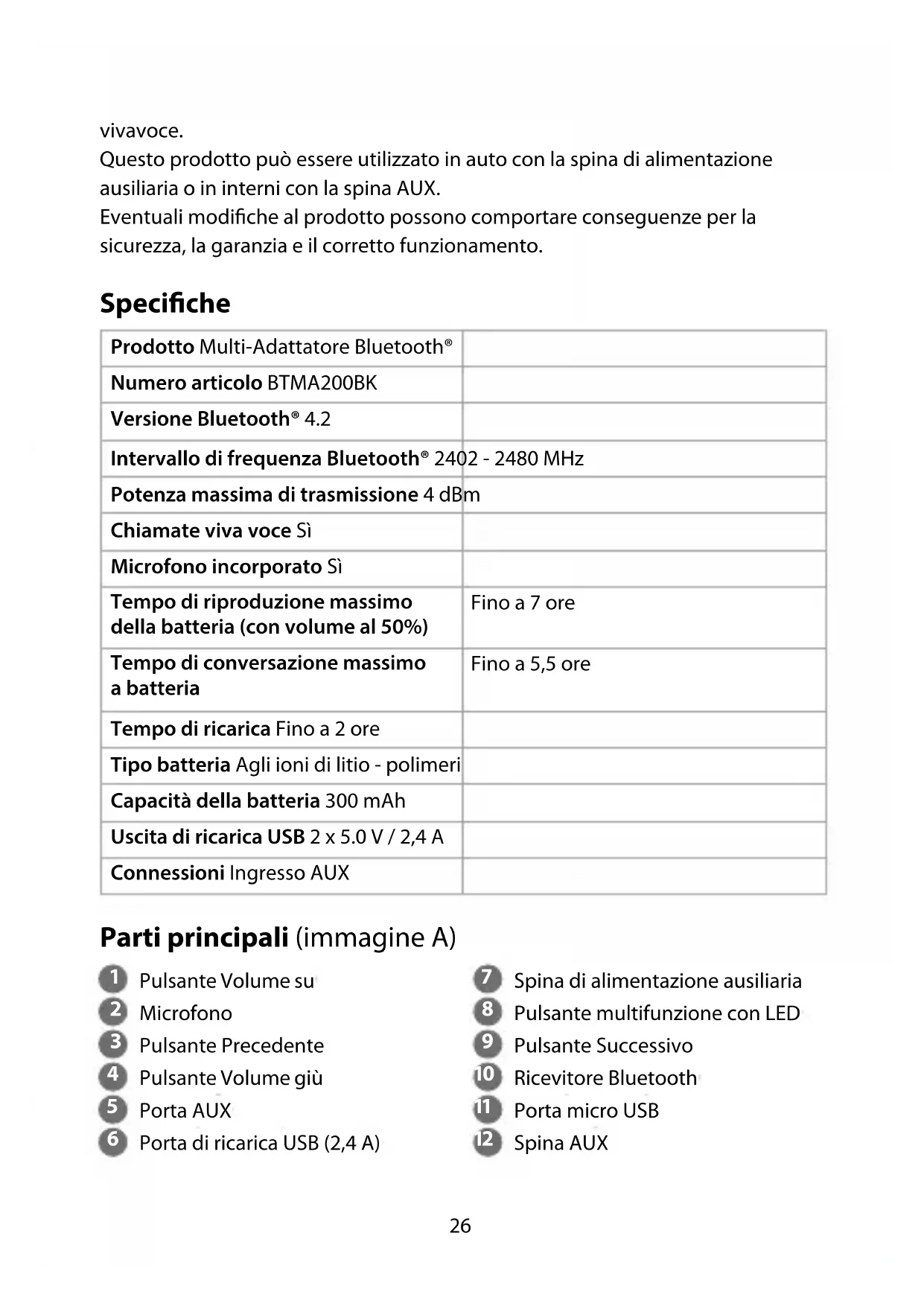 Guida rapida all’avvio Multi-Adattatore Bluetooth® BTMA200BK Per maggiori informazioni vedere il manuale esteso online: ned.is/btma200bk Uso previsto Nedis BTMA200BK è inteso esclusivamente per essere utilizzato come kit viva voce con Bluetooth. Il prodotto dispone di un microfono integrato per effettuare chiamate in viva voce e le porte di ricarica USB integrate possono essere utilizzate per ricaricare qualsiasi dispositivo.Il prodotto è inteso solo per utilizzo in interni e in auto.Il prodotto non è inteso per utilizzi professionali.Il prodotto è inteso esclusivamente per la riproduzione di musica da un dispositivo Bluetooth e per rispondere ed effettuare chiamate telefoniche26 vivavoce. Questo prodotto può essere utilizzato in auto con la spina di alimentazione ausiliaria o in interni con la spina AUX. Eventuali modifiche al prodotto possono comportare conseguenze per la sicurezza, la garanzia e il corretto funzionamento. Speciche Prodotto Multi-Adattatore Bluetooth® Numero articolo BTMA200BK Versione Bluetooth® 4.2 Intervallo di frequenza Bluetooth® 2402 - 2480 MHz Potenza massima di trasmissione 4 dBm Chiamate viva voce Sì Microfono incorporato Sì Tempo di riproduzione massimo della batteria (con volume al 50%) Fino a 7 ore Tempo di conversazione massimo a batteria Fino a 5,5 ore Tempo di ricarica Fino a 2 ore Tipo batteria Agli ioni di litio - polimeri Capacità della batteria 300 mAh Uscita di ricarica USB 2 x 5.0 V / 2,4 A Connessioni Ingresso AUX Parti principali (immagine A)