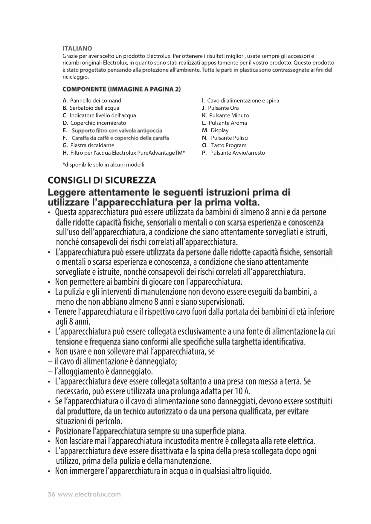 - Non immergere l’apparecchiatura in acqua o in qualsiasi altro liquido. 36 www.electrolux.com• L’apparecchiatura e gli accessori si riscaldano durante il funzionamento. Utilizzare di pulirla o riporla.