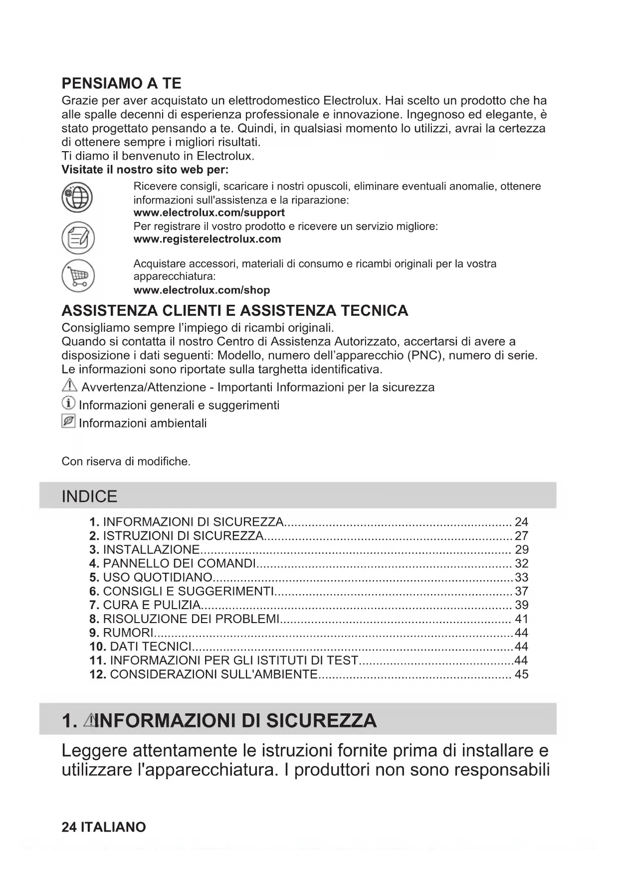 Grazie per aver acquistato un elettrodomestico Electrolux. Hai scelto un prodotto che haalle spalle decenni di esperienza professionale e innovazione. Ingegnoso ed elegante, èstato progettato pensando a te. Quindi, in qualsiasi momento lo utilizzi, avrai la certezzadi ottenere sempre i migliori risultati.Ti diamo il benvenuto in Electrolux.Visitate il nostro sito web per:Ricevere consigli, scaricare i nostri opuscoli, eliminare eventuali anomalie, ottenereinformazioni sull'assistenza e la riparazione:www.electrolux.com/supportPer registrare il vostro prodotto e ricevere un servizio migliore:www.registerelectrolux.comAcquistare accessori, materiali di consumo e ricambi originali per la vostraapparecchiatura:www.electrolux.com/shop