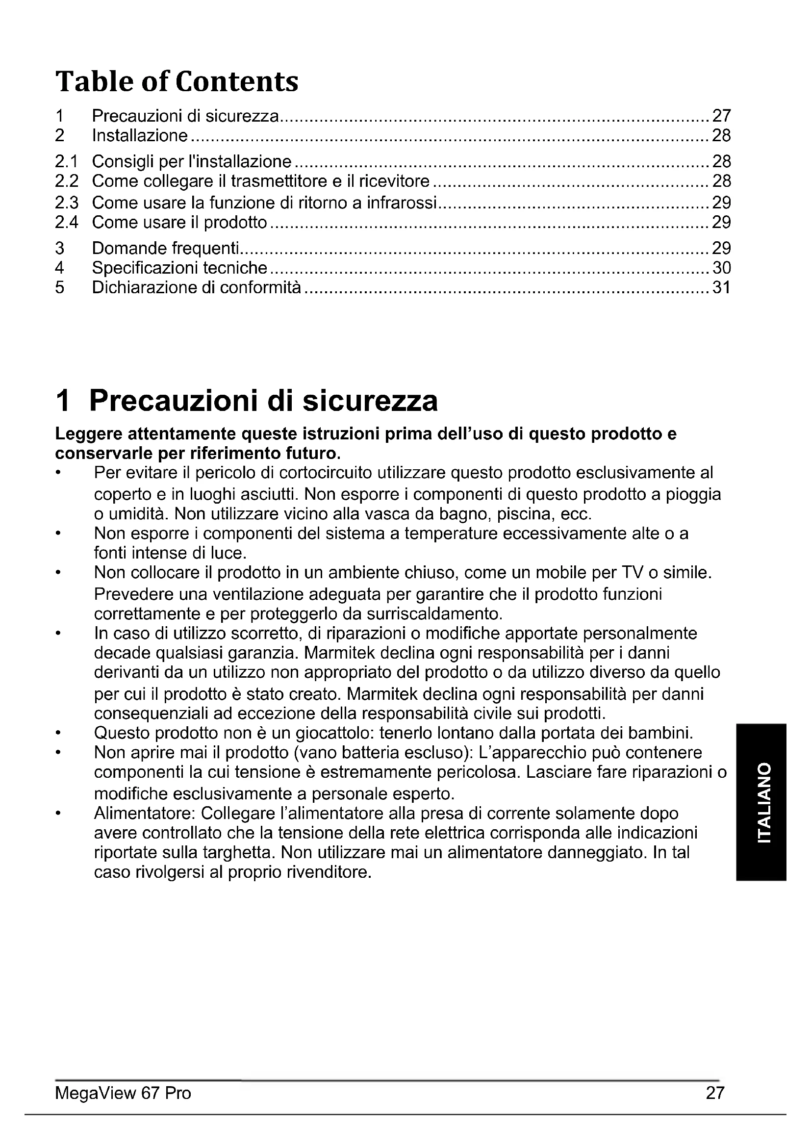 Scarica le istruzioni per il tuo Estensione audio/video in formato PDF gratuitamente! Trova il tuo manuale MegaView 67 Pro - MARMITEK e riprendi in mano il tuo dispositivo elettronico. In questa pagina sono pubblicati tutti i documenti necessari per l'utilizzo del tuo dispositivo. MegaView 67 Pro del marchio MARMITEK.