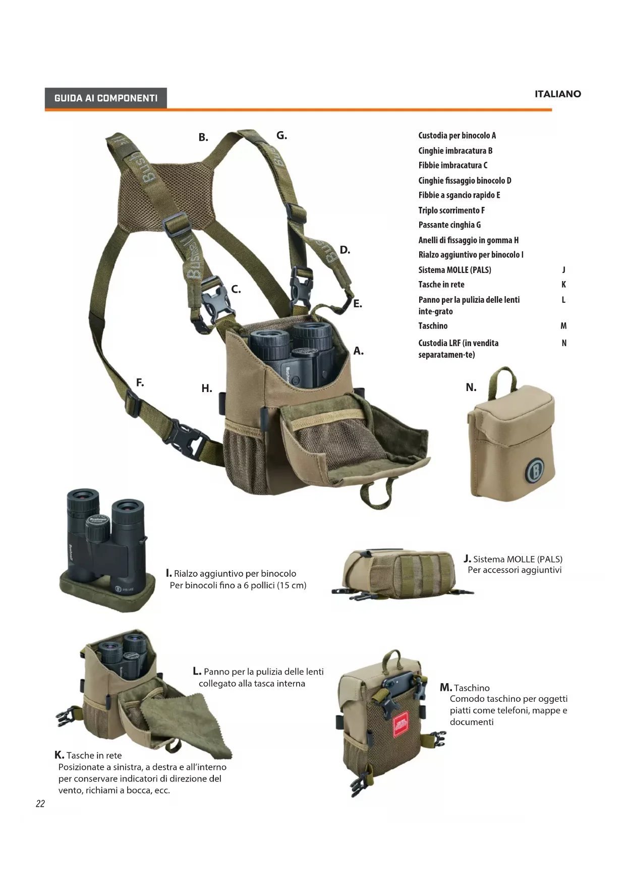 Custodia per binocolo A Cinghie imbracatura B Fibbie imbracatura C Cinghie ssaggio binocolo D Fibbie a sgancio rapido E Triplo scorrimento F Passante cinghia G Anelli di ssaggio in gomma H Rialzo aggiuntivo per binocolo I Sistema MOLLE (PALS) J Tasche in rete K Panno per la pulizia delle lenti inte-grato