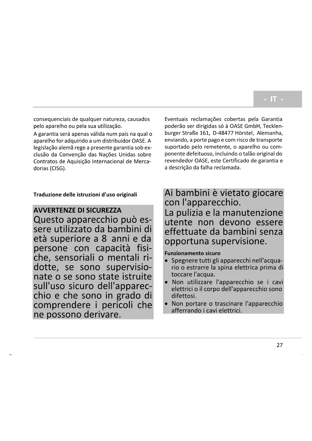 OASE. Se l'apparecchiatura viene ulteriorme- mente rivenduta, la data di scadenza della garan- zia non subisce modifiche. Entro il periodo di ga- ranzia, la stessa può essere prorogata o rinno- vata. I diritti legali dell'acquirente derivanti in particolare dalla garanzia mantengono la propria validità e non vengono limitati dalle presenti pre- stazioni. Condizioni di garanzia L’azienda OASE GmbH rilascia una garanzia per le caratteristiche eccellenti e la lavorazione per- fetta in funzione dello scopo d’impiego, per l’as- semblaggio eseguito a regola d’arte e la funzio- nalità corretta dell’apparecchiatura. Le presta- zioni di garanzia si riferiscono, a discrezione del costruttore, alla riparazione o alla fornitura gra- tuite di parti di ricambio o di una apparecchia- tura sostitutiva. Nel caso in cui il modello in og- getto non venisse più fabbricato, il costruttore si riserva il diritto di fornire, a propria discrezione, una apparecchiatura sostitutiva della gamma OASE il più possibile simile al tipo contestato. Non rientrano nella garanzia le contestazioni le cui cause sono imputabili a errori di montaggio e di manovra nonché a manutenzione insuffi- ciente, impiego non conforme alle prescrizioni, effetto del gelo, troncature di connettori, accor- ciamento di cavi, depositi calcarei o tentativi di riparazione non eseguiti correttamente. Per un impiego corretto dell’apparecchiatura, prendere attentamente visione delle istruzioni d’uso parte integrante della garanzia. Non sono coperte da garanzia le parti soggette a usura, ad es. i corpi luminosi. Sono esclusi dalla garanzia il rimborso per costi lavorativi derivanti da operazioni di smontaggio e montaggio, verifiche, richieste di profitti non realizzati e risarcimento danni, nonché ulteriori diritti relativi a danni e perdite di qualsiasi tipo provocati dall’apparecchiatura o da un uso im- proprio della stessa. La garanzia è valida solo per il paese in cui è stata acquistata l’apparecchiatura, presso un rivendi- tore specializzato OASE. Per questa garanzia vale il diritto tedesco, con esclusione dell’accordo delle Nazioni Unite relativo a contratti interna- zionali per la vendita di merci (CISG). I diritti derivanti dalla garanzia possono essere ri- vendicati solo nei confronti dell'azienda OASE GmbH, Tecklenburger Straße 161, D- 48477 Hörstel/Germany inviando all'origine in porto affrancato e a rischio di trasporto a carico del mittente l'apparecchiatura o il componente contestati e allegando una copia della pezza giu- stificativa di vendita originale del rivenditore specializzato OASE, il presente atto di garanzia e specificando per iscritto il difetto reclamato.- DA -