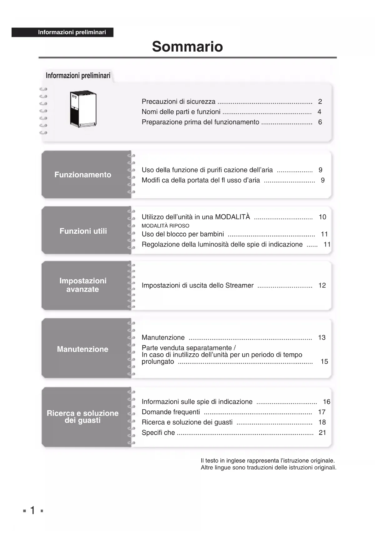 Presa di correnteSpina di alimentazione Informazioni sullo scarico dello Streamer In alcuni casi, l’uscita aria può emettere un leggero odore in quanto vengono generate tracce di ozono. Tuttavia, la quantità è trascurabile e non nuoce alla salute. Il prodotto non è in grado di eliminare tutte le sostanze tossiche presenti nel fumo di tabacco (monossido di carbonio, ecc.) 6-3P664947-7-OM-MC30YVM-SLEEP-DAIKIN-IT.indd 76-3P664947-7-OM-MC30YVM-SLEEP-DAIKIN-IT.indd 7 11/1/2022 12:12:21 PM11/1/2022 12:12:21 PM8 Italiano Informazioni preliminari