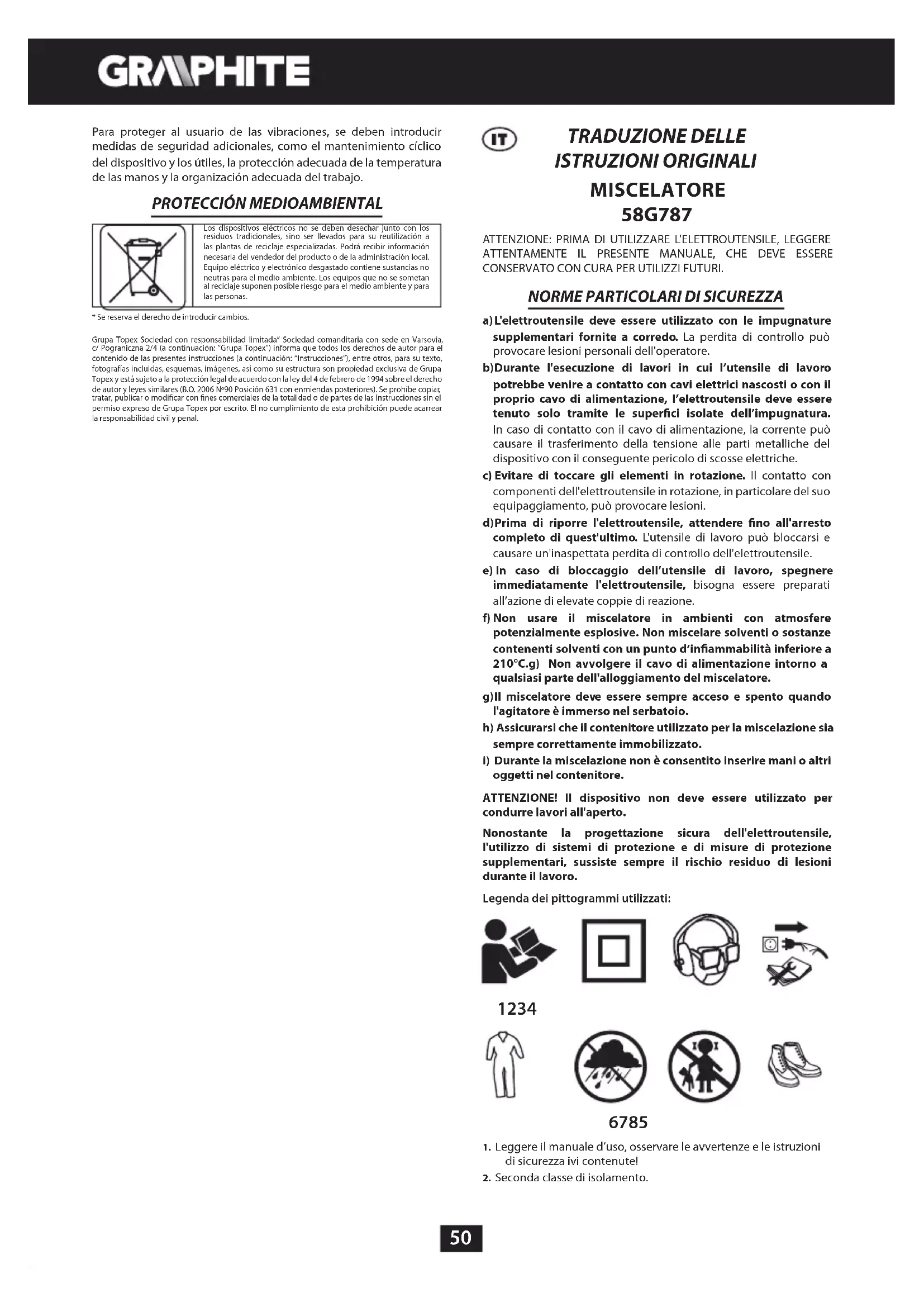 - Ci si riserva il diritto di effettuare modifiche. La „Grupa Topex Spółka z ograniczoną odpowiedzialnością” Spółka komandytowa con sede a Varsavia, ul. Pograniczna 2/4 (detta di seguito: „ Grupa Topex”) informa che tutti i diritti d’autore sul contenuto del presente manuale (detto di seguito: „Manuale”), che riguardano, tra l’altro, il testo, le fotografie, gli schemi e i disegni contenuti e anche la sua composizione, appartengono esclusivamente alla Grupa Topex sono protetti giuridicamente secondo la legge del 4 febbraio 1994, sul diritto d’autore e diritti connessi (Gazz. Uff. polacca del 2006 n. 90 posizione 631 con successive modifiche). La copia, l’elaborazione, la pubblicazione, la modifica a scopo commerciale, sia dell’intero Manuale che di singoli suoi elementi, senza il consenso scritto della Grupa Topex, sono severamente vietate e comportano responsabilità civile e penale.53
