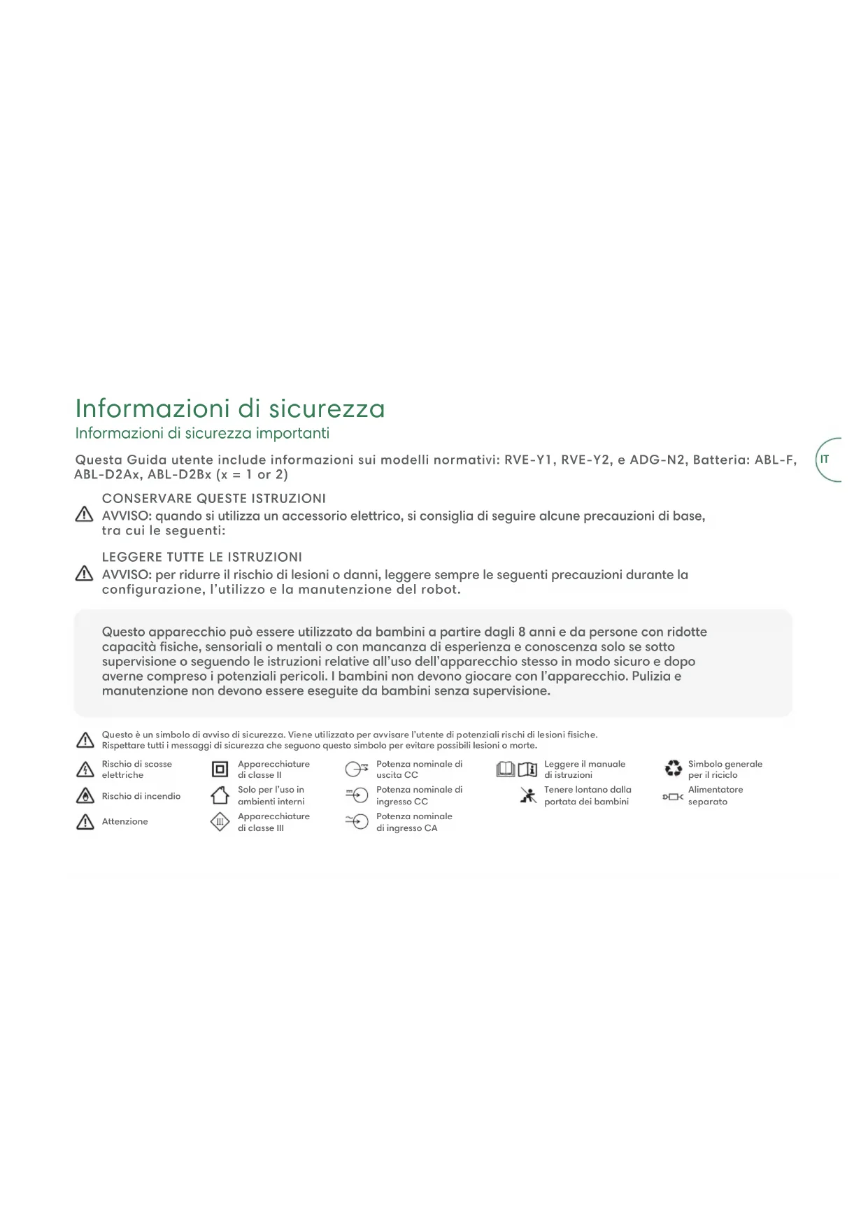 AVVISO: per ridurre il rischio di lesioni o danni, leggere sempre le seguenti precauzioni durante la configurazione, l’utilizzo e la manutenzione del robot. Questa Guida utente include informazioni sui modelli normativi: RVE-Y1, RVE-Y2, e ADG-N2, Batteria: ABL-F, ABL-D2Ax, ABL-D2Bx (x = 1 or 2) Questo è un simbolo di avviso di sicurezza. Viene utilizzato per avvisare l’utente di potenziali rischi di lesioni siche. Rispettare tutti i messaggi di sicurezza che seguono questo simbolo per evitare possibili lesioni o morte. Rischio di scosse elettriche Apparecchiature diclasse II Potenza nominale di uscita CC Leggere il manuale diistruzioni Simbolo generale peril riciclo Rischio di incendio Solo per l’uso in ambienti interni Potenza nominale di ingresso CC Tenere lontano dalla portata dei bambini Alimentatore separato Attenzione Apparecchiature di classe III Potenza nominale diingresso CAIT AVVISO: indica una situazione pericolosa che potrebbe provocare potenzialmente morte o lesioni gravi. ATTENZIONE: indica una situazione pericolosa che potrebbe provocare potenzialmente lievi lesioni. COMUNICAZIONE: indica una situazione pericolosa che potrebbe provocare potenzialmente danni materiali. GENERALE AVVISO