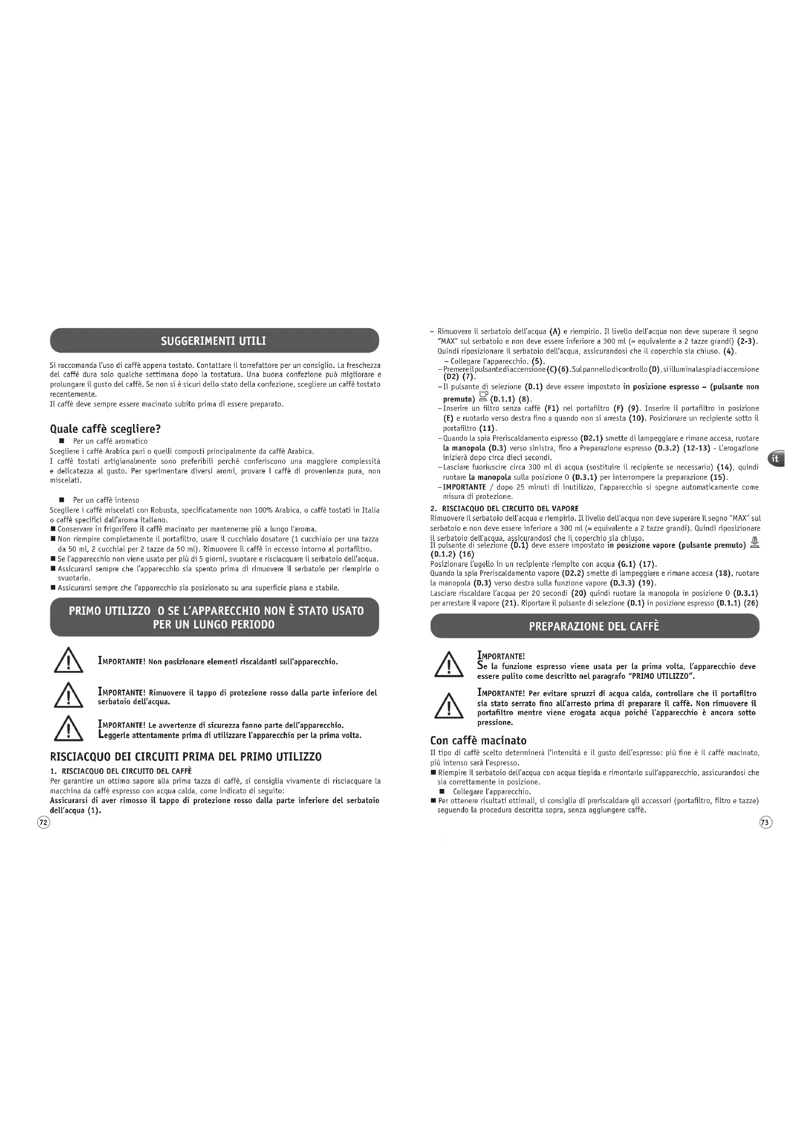 (D.1.2) (16) Posizionare l’ugello in un recipiente riempito con acqua (G.1) (17). Quando la spia Preriscaldamento vapore (D2.2) smette di lampeggiare e rimane accesa (18), ruotare la manopola (D.3) verso destra sulla funzione vapore (D.3.3) (19). Lasciare riscaldare l’acqua per 20 secondi (20) quindi ruotare la manopola in posizione O (D.3.1) per arrestare il vapore (21). Riportare il pulsante di selezione (D.1) in posizione espresso (D.1.1) (26) SUGGERIMENTI UTILI Si raccomanda l’uso di caffè appena tostato. Contattare il torrefattore per un consiglio. La freschezza del caffè dura solo qualche settimana dopo la tostatura. Una buona confezione può migliorare e prolungare il gusto del caffè. Se non si è sicuri dello stato della confezione, scegliere un caffè tostato recentemente. Il caffè deve sempre essere macinato subito prima di essere preparato. Quale caffè scegliere? Per un caffè aromatico Scegliere i caffè Arabica puri o quelli composti principalmente da caffè Arabica. I caffè tostati artigianalmente sono preferibili perché conferiscono una maggiore complessità e delicatezza al gusto. Per sperimentare diversi aromi, provare i caffè di provenienza pura, non miscelati. Per un caffè intenso Scegliere i caffè miscelati con Robusta, specificatamente non 100% Arabica, o caffè tostati in Italia o caffè specifici dall’aroma italiano. Conservare in frigorifero il caffè macinato per mantenerne più a lungo l’aroma. Non riempire completamente il portafiltro, usare il cucchiaio dosatore (1 cucchiaio per una tazza da 50 ml, 2 cucchiai per 2 tazze da 50 ml). Rimuovere il caffè in eccesso intorno al portafiltro. Se l’apparecchio non viene usato per più di 5 giorni, svuotare e risciacquare il serbatoio dell’acqua. Assicurarsi sempre che l’apparecchio sia spento prima di rimuovere il serbatoio per riempirlo o svuotarlo. Assicurarsi sempre che l’apparecchio sia posizionato su una superficie piana e stabile. PRIMO UTILIZZO O SE L’APPARECCHIO NON È STATO USATO