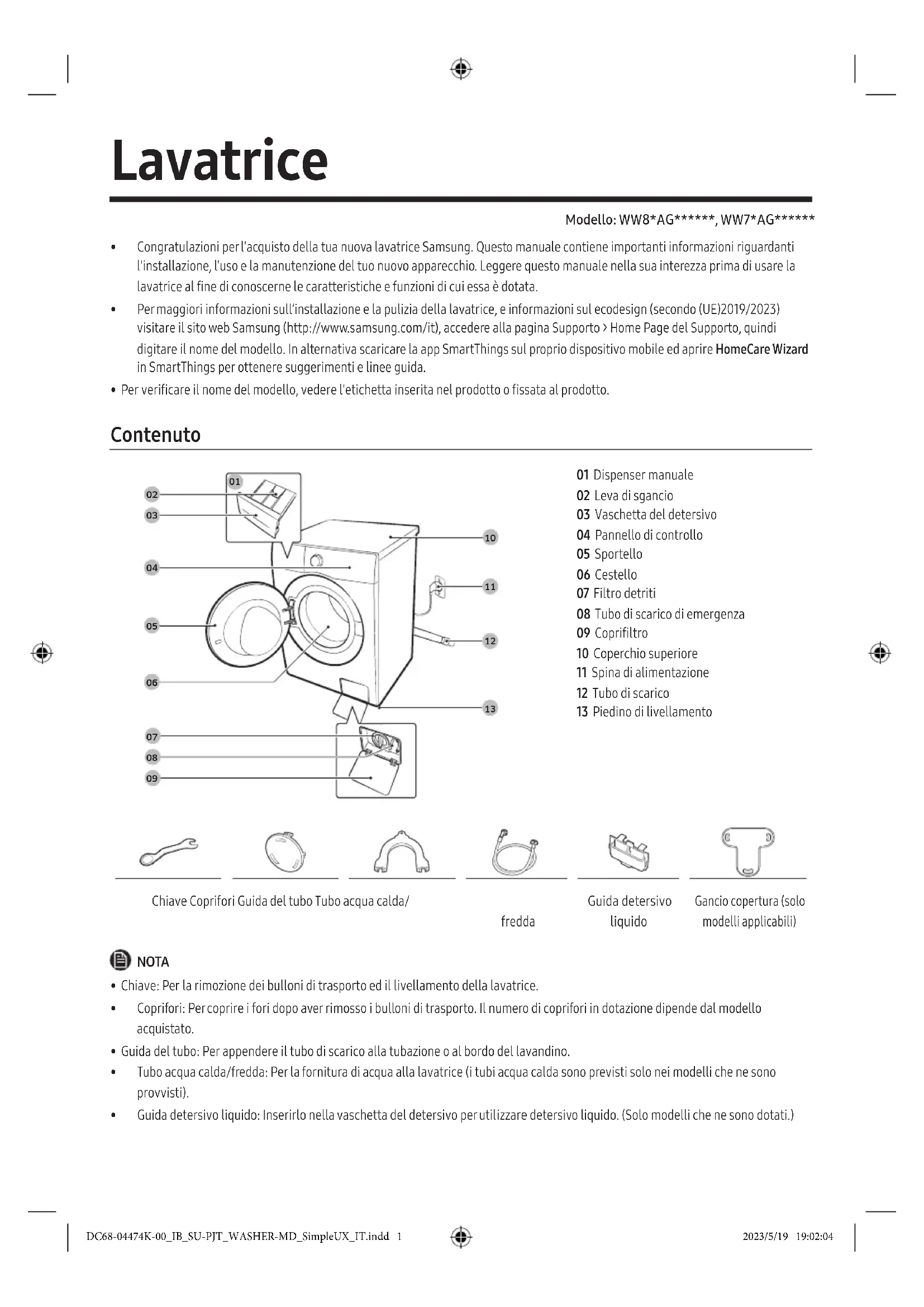 - Per maggiori informazioni sull’installazione e la pulizia della lavatrice, e informazioni sul ecodesign (secondo (UE)2019/2023) visitare il sito web Samsung (http://www.samsung.com/it), accedere alla pagina Supporto > Home Page del Supporto, quindi digitare il nome del modello. In alternativa scaricare la app SmartThings sul proprio dispositivo mobile ed aprire HomeCare Wizard in SmartThings per ottenere suggerimenti e linee guida.
