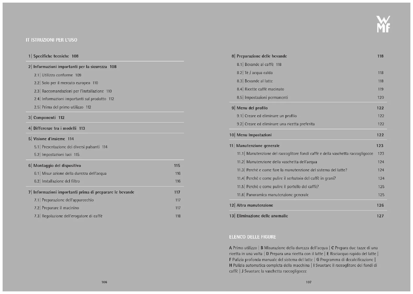 A Primo utilizzo | B Misurazione della durezza dell’acqua | C Prepara due tazze di una ricetta in una volta | D Prepara una ricetta con il latte | E Risciacquo rapido del latte| F Pulizia profonda manuale del sistema del latte | G Programma di decalcificazione | HPulizia automatica completa della macchina | I Svuotare il raccoglitore dei fondi di caffè | J Svuotare la vaschetta raccogligocce 106 107SERIEWMF PERFECTION 700
