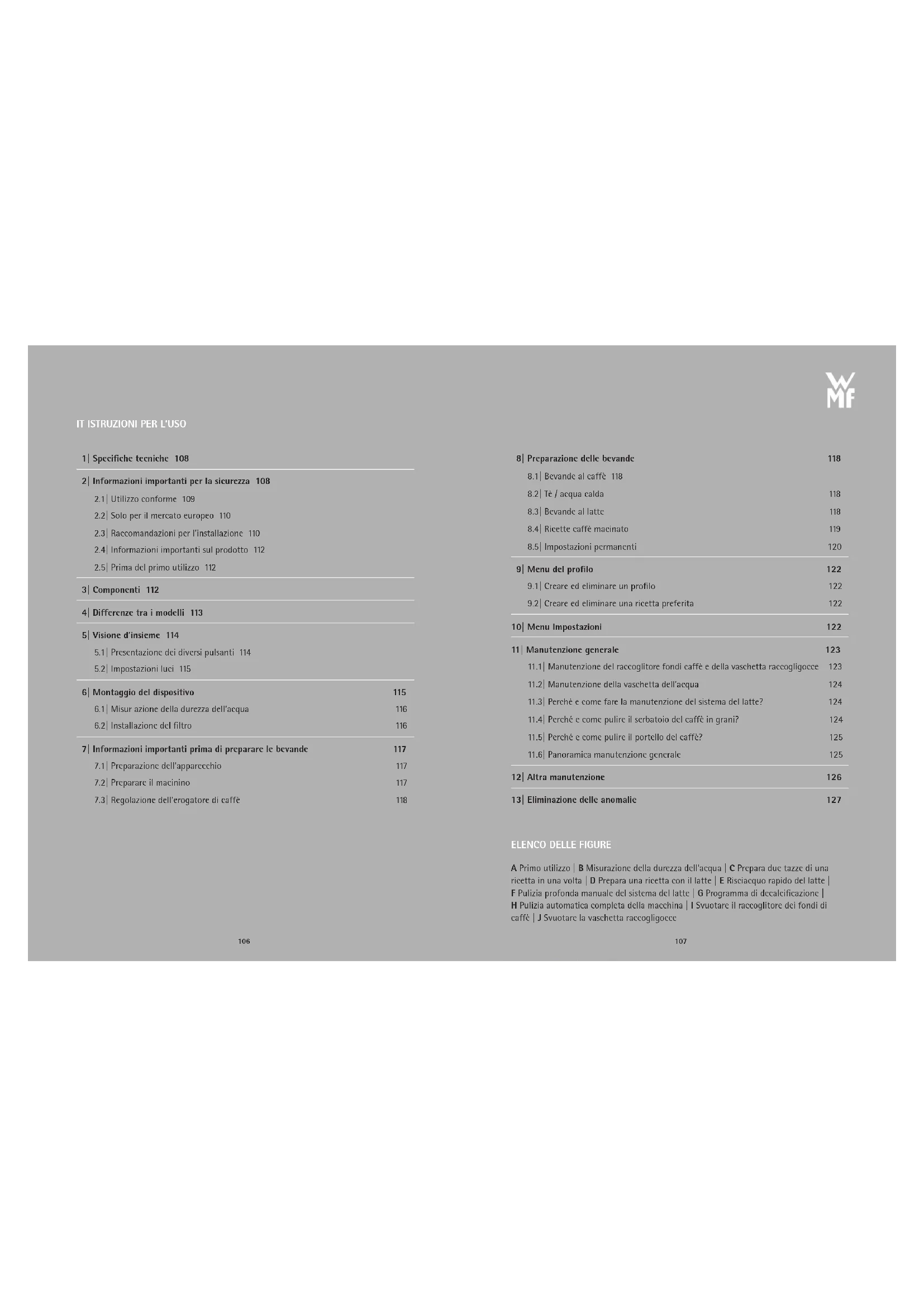 A Primo utilizzo | B Misurazione della durezza dell’acqua | C Prepara due tazze di una ricetta in una volta | D Prepara una ricetta con il latte | E Risciacquo rapido del latte| F Pulizia profonda manuale del sistema del latte | G Programma di decalcificazione | HPulizia automatica completa della macchina | I Svuotare il raccoglitore dei fondi di caffè | J Svuotare la vaschetta raccogligocce 106 107SERIEWMF PERFECTION 700