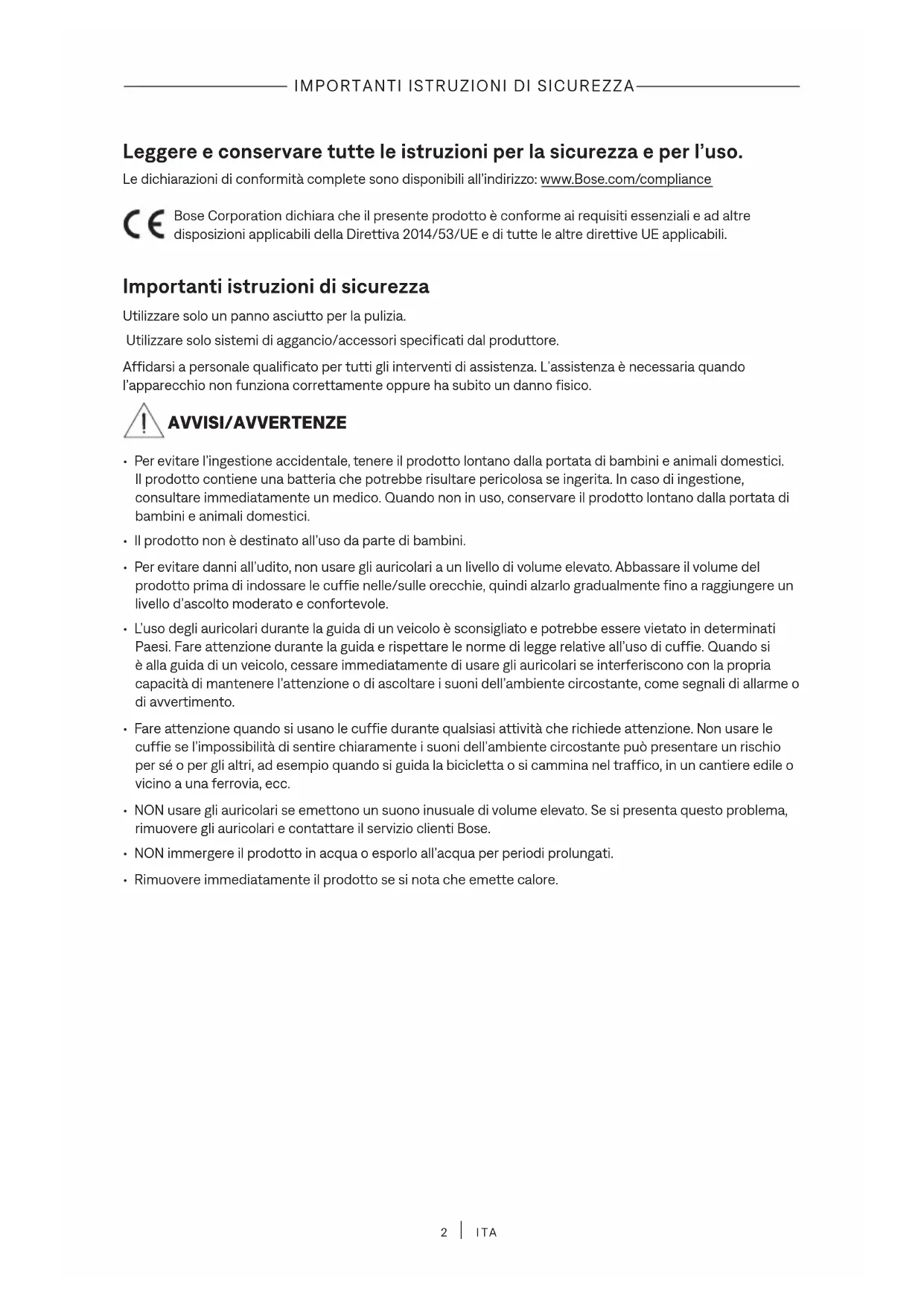 ITA Leggere e conservare tutte le istruzioni per la sicurezza e per l’uso. Le dichiarazioni di conformità complete sono disponibili all’indirizzo: www.Bose.com/compliancewww.Bose.com/compliance Bose Corporation dichiara che il presente prodotto è conforme ai requisiti essenziali e ad altre disposizioni applicabili della Direttiva 2014/53/UE e di tutte le altre direttive UE applicabili. Importanti istruzioni di sicurezza Utilizzare solo un panno asciutto per la pulizia. Utilizzare solo sistemi di aggancio/accessori specificati dal produttore. Affidarsi a personale qualificato per tutti gli interventi di assistenza. L’assistenza è necessaria quando l’apparecchio non funziona correttamente oppure ha subito un danno fisico. AVVISI/AVVERTENZE