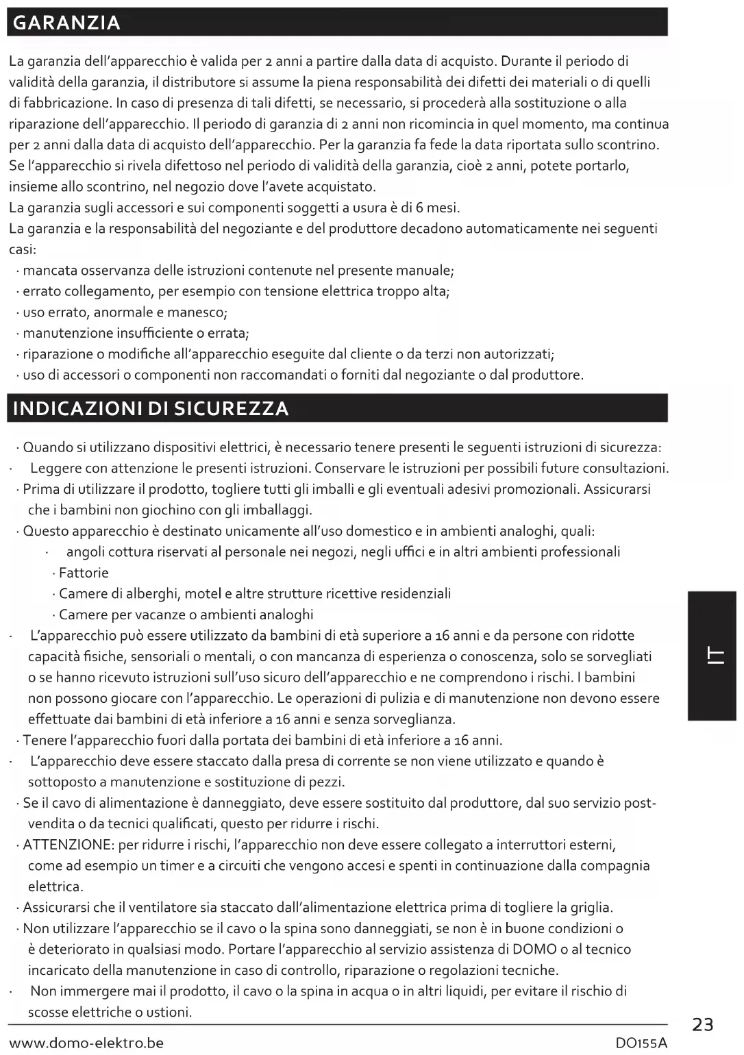 MISURE AMBIENTALI Il simbolo sul prodotto o sulla confezione indica che esso non deve essere trattato come riuto domestico. Deve, al contrario, essere conferito al punto di raccolta predisposto per il riciclo delle apparecchiature elettriche ed elettroniche. Facendo in modo che questo prodotto venga smaltito correttamente aiuterete a prevenire potenziali conseguenze negative per l’ambiente e la salute dell’uomo, che potrebbero essere causate da uno smaltimento non corretto. Per maggiori informazioni sul riciclo di questo prodotto, consultare le autorità comunali, l’azienda o il servizio responsabili della raccolta dei riuti domestici o il negozio in cui il prodotto è stato acquistato. Il materiale di imballaggio è riciclabile. Lo smaltimento dell’imballaggio deve avvenire al ne di tutelare l’ambiente.27 DO155A www.domo-elektro.be