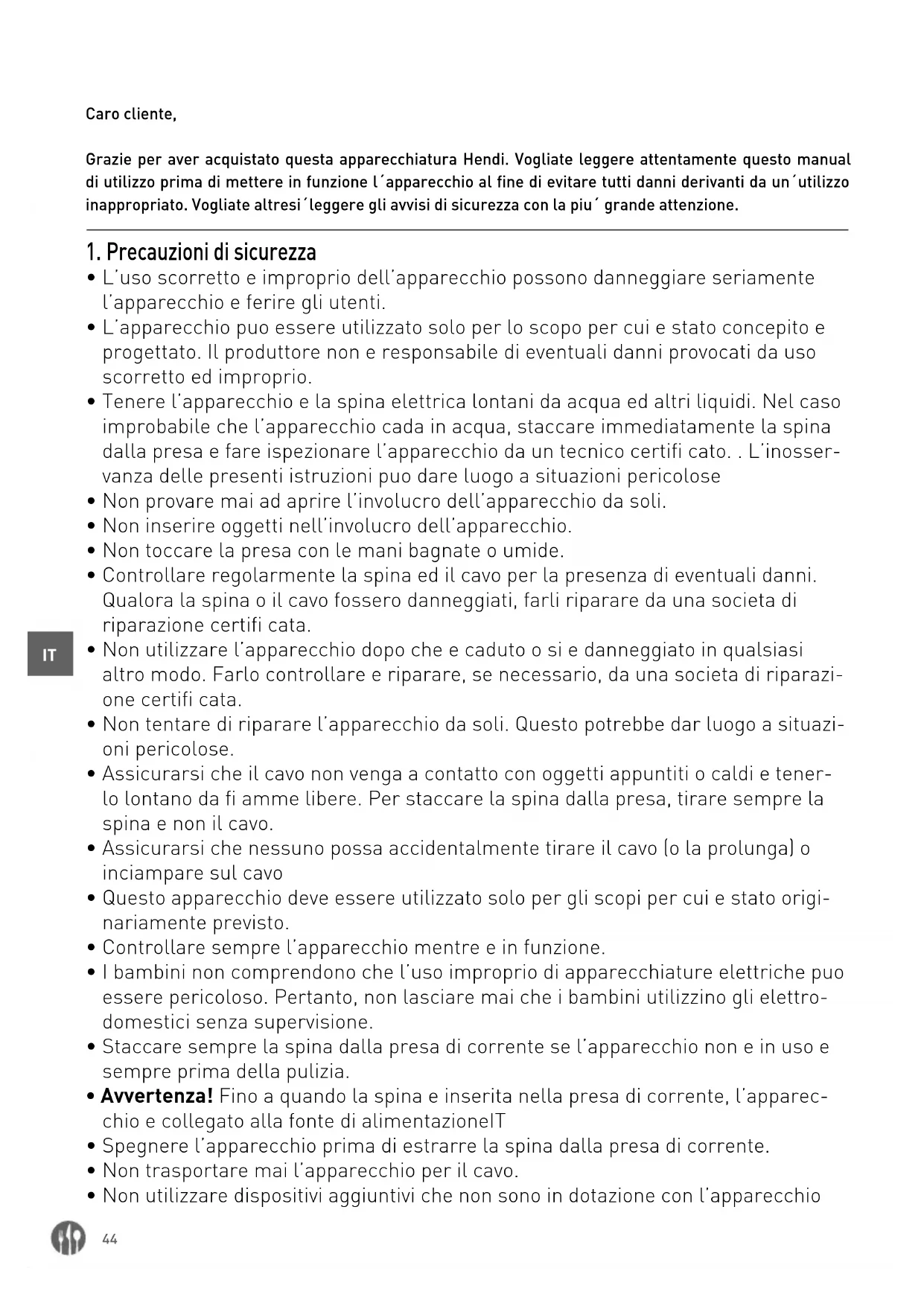 Caro cliente, Grazie per aver acquistato questa apparecchiatura Hendi. Vogliate leggere attentamente questo manual di utilizzo prima di mettere in funzione l´apparecchio al fine di evitare tutti danni derivanti da un´utilizzo inappropriato. Vogliate altresi´leggere gli avvisi di sicurezza con la piu´ grande attenzione.