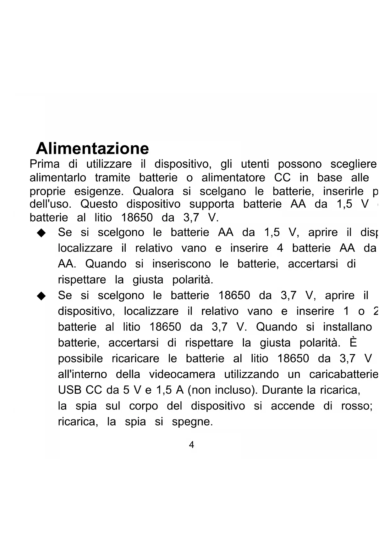 Alimentazione Prima di utilizzare il dispositivo, gli utenti possono scegliere se alimentarlo tramite batterie o alimentatore CC in base alle proprie esigenze. Qualora si scelgano le batterie, inserirle prima dell'uso. Questo dispositivo supporta batterie AA da 1,5 V e batterie al litio 18650 da 3,7 V.