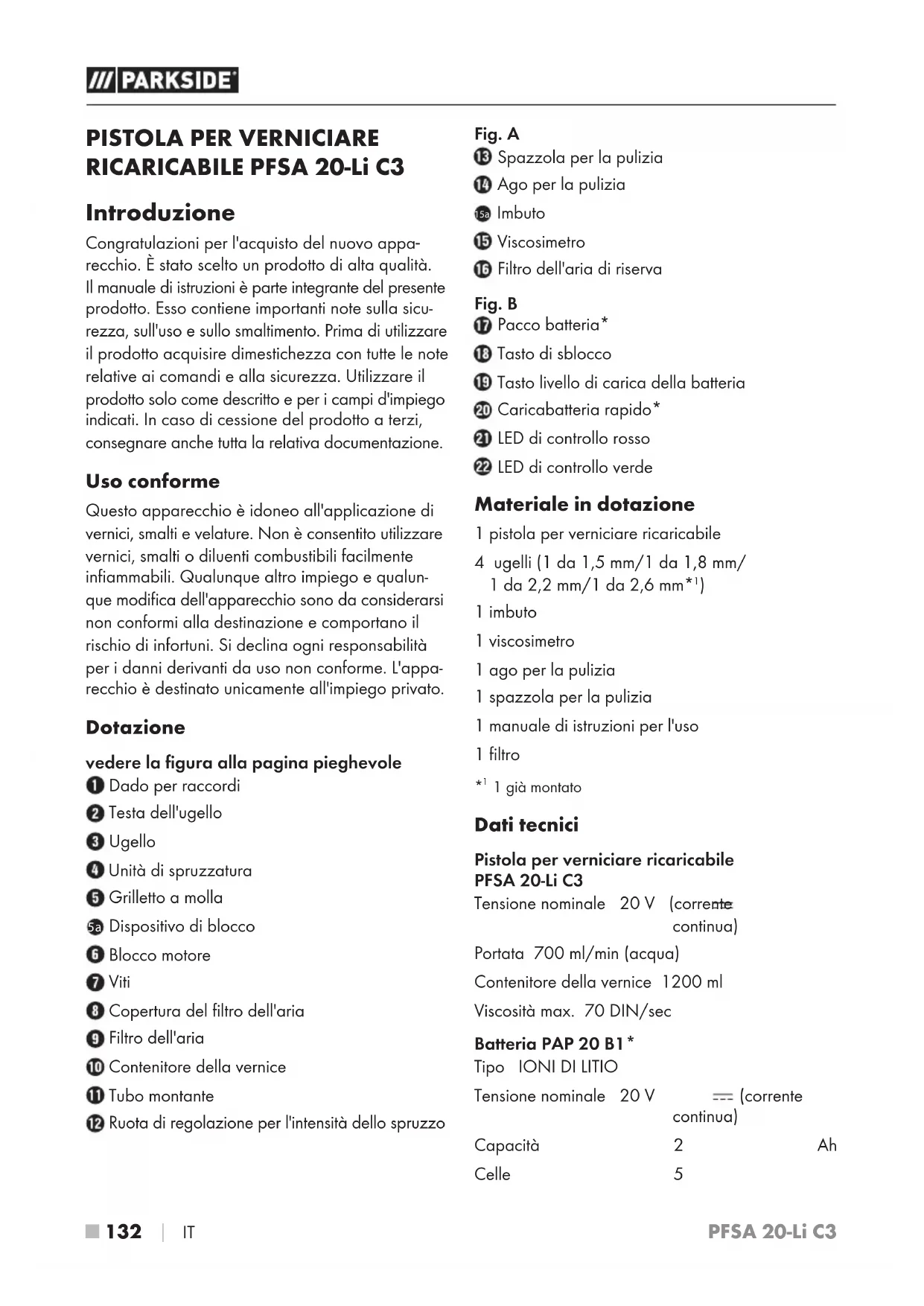 PAPS204A1/PAPS208A1. ♦ Su www.Lidl.de/akku è disponibile un elenco aggiornato di tutte le batterie compatibili. Indicazioni per il lavoro Viscosità Con questo apparecchio si possono spruzzare prodotti con una viscosità massima pari a 70DIN-sec. La viscosità viene rilevata in un procedimento di misurazione semplificato con l'ausilio dell'apposito viscosimetro fornito in dotazione. ♦ Attingere il prodotto da spruzzare con il viscosi- metro riempiendo quest'ultimo fino al bordo. ♦ Prelevare il viscosimetro dal prodotto da spruzzare e lasciare defluire il liquido. ♦ Misurare il tempo di flusso in secondi fino al momento in cui l'uscita del liquido si interrompe. Questo tempo di flusso è indicato come "secondi DIN (DIN-sec)". ♦ Se il valore è troppo elevato, aggiungere al prodotto da spruzzare un adeguato diluente procedendo gradualmente con piccole quantità, poi mescolare. ♦ Misurare nuovamente i secondi DIN. Ripetere l'operazione fino a quando non si raggiunge una viscosità inferiore a 70 DIN-sec. NOTA ► Non superare il valore di viscosità massimo previsto per l'apparecchio. Il prodotto da spruzzare non deve essere troppo denso per l'operazione di spruzzatura. In caso contrario, l'apparecchio potrebbe intasarsi. ► Assicurarsi che il prodotto da spruzzare e il diluente siano compatibili. Se si utilizza il diluente sbagliato, si formano grumi che provocano l’intasamento dell’apparecchio. Non mescolare mai smalti a base di resina sintetica con diluente nitro. NOTA ► Per informazioni sul diluente adeguato (ac- qua, diluente per vernici), si prega di consul- tare le indicazioni sul prodotto da spruzzare fornite dal relativo produttore. ► È vietato spruzzare prodotti a grana grossa o contenenti corpi solidi. Il loro effetto smeriglian- te riduce la durata utile dell’apparecchio. Preparazione della superficie daspruzzare ♦ Coprire completamente la zona circostante l'area destinata alla spruzzatura. In caso con- trario tutte le superfici non coperte potrebbero essere sporcate. ♦ Sincerarsi che la superficie da spruzzare sia pulita, asciutta e non unta. ♦ Irruvidire le superfici lisce e in seguito rimuovere la polvere di levigatura. Prima della messa in funzione Carica del pacco batteria (vedi fig. B) CAUTELA! ► Staccare sempre la spina dalla presa di cor- rente prima di rimuovere il pacco batteria dall'apparecchio o inserirvelo. NOTA ► Non caricare il pacco batteria se la tempera- tura ambiente è al di sotto di 10 °C o al di sopra di 40 °C. Se si intende conservare la batteria agli ioni di litio per un periodo pro- lungato, occorre controllarne periodicamente la carica. La carica ottimale è compresa tra il 50% e l'80%. La batteria deve essere conser- vata in un luogo fresco e asciutto, a una temperatura ambiente compresa fra 0 °C e 50 °C. ♦ Inserire il pacco batteria nel caricabatteria rapido . ♦ Inserire la spina nella presa. Il LED di controllo rosso si accende e indica il processo di carica.PFSA 20-Li C3 ■ 138