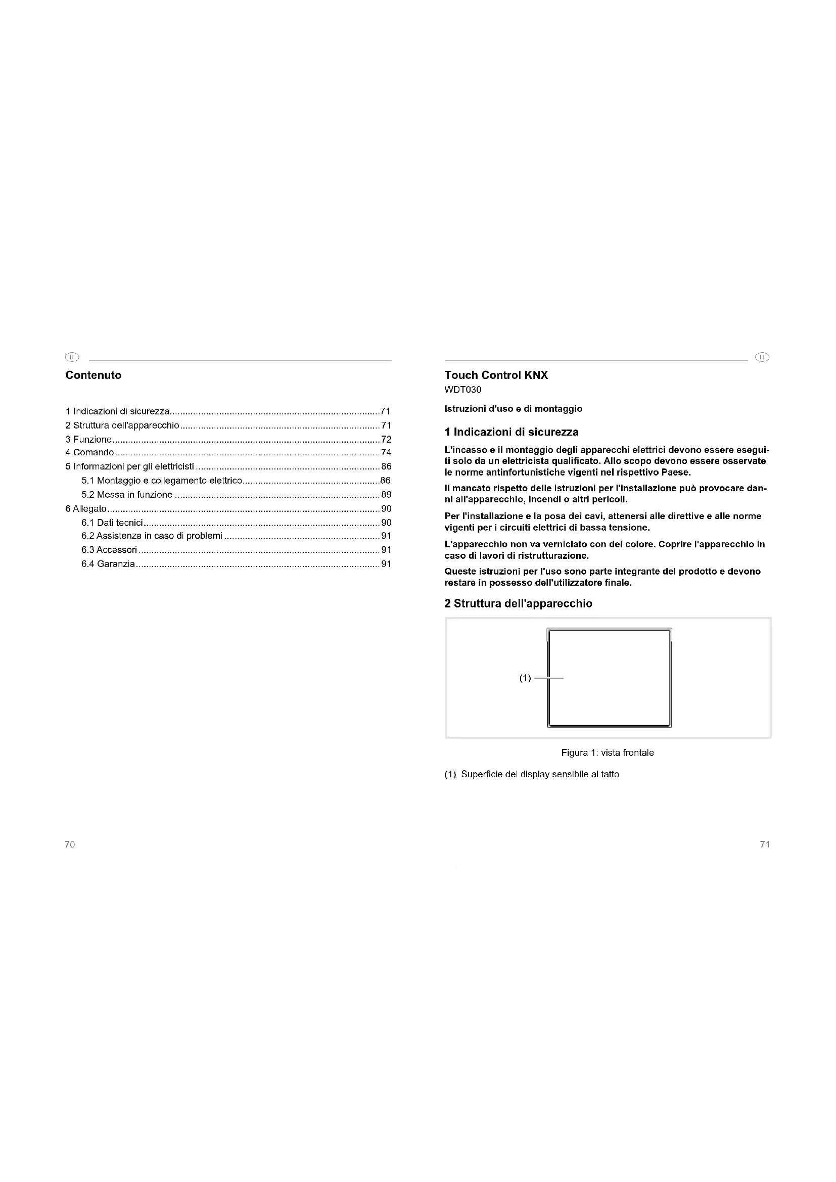 Touch Control KNX WDT030 Istruzioni d'uso e di montaggio 1 Indicazioni di sicurezza L'incasso e il montaggio degli apparecchi elettrici devono essere esegui- ti solo da un elettricista qualicato. Allo scopo devono essere osservate le norme antinfortunistiche vigenti nel rispettivo Paese. Il mancato rispetto delle istruzioni per l'installazione può provocare dan- ni all'apparecchio, incendi o altri pericoli. Per l'installazione e la posa dei cavi, attenersi alle direttive e alle norme vigenti per i circuiti elettrici di bassa tensione. L'apparecchio non va verniciato con del colore. Coprire l'apparecchio in caso di lavori di ristrutturazione. Queste istruzioni per l'uso sono parte integrante del prodotto e devono restare in possesso dell'utilizzatore nale. 2 Struttura dell'apparecchio (1) Figura 1: vista frontale (1) Supercie del display sensibile al tatto