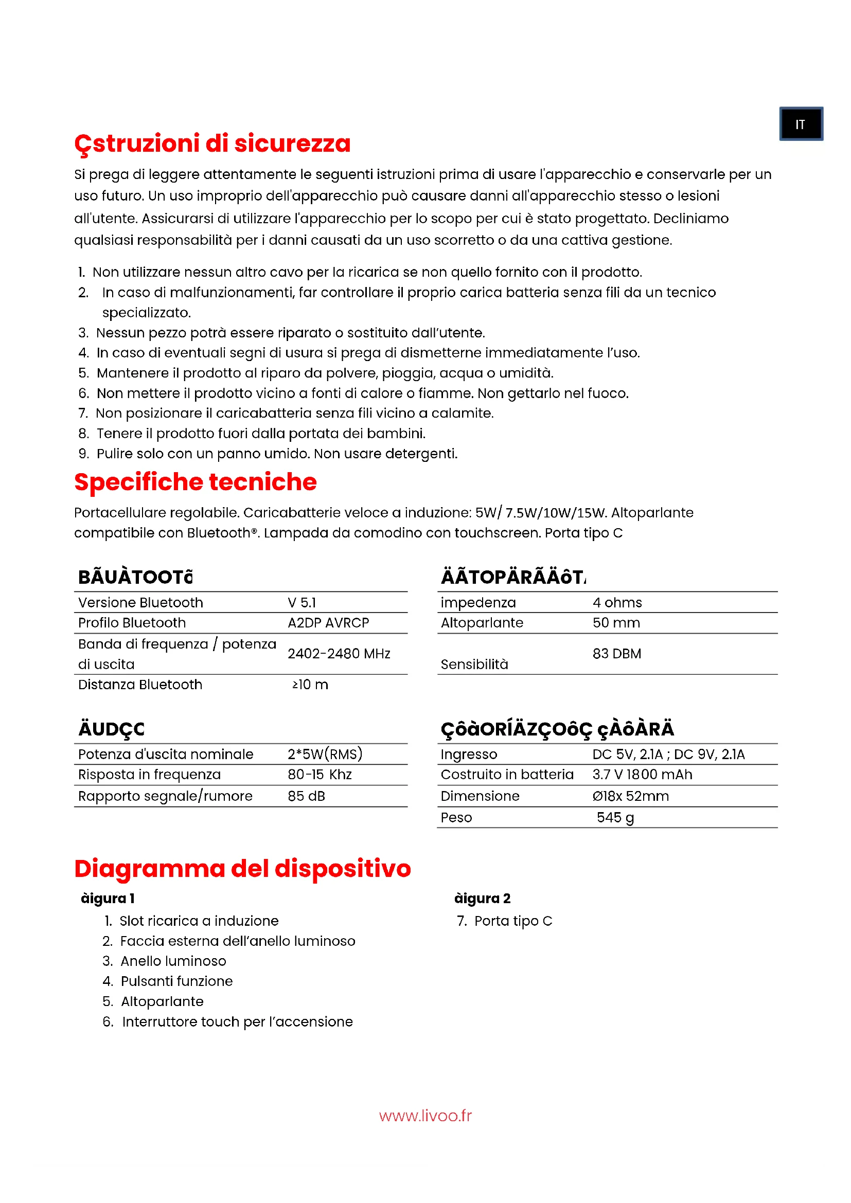 specializzato. 3. Nessun pezzo potrà essere riparato o sostituito dall’utente. 4. In caso di eventuali segni di usura si prega di dismetterne immediatamente l’uso. 5. Mantenere il prodotto al riparo da polvere, pioggia, acqua o umidità. 6. Non mettere il prodotto vicino a fonti di calore o fiamme. Non gettarlo nel fuoco. 7. Non posizionare il caricabatteria senza fili vicino a calamite. 8. Tenere il prodotto fuori dalla portata dei bambini. 9. Pulire solo con un panno umido. Non usare detergenti. Specifiche tecniche Portacellulare regolabile. Caricabatterie veloce a induzione: 5W/ 7.5W/10W/15W . Altoparlante compatibile con Bluetooth®. Lampada da comodino con touchscreen. Porta tipo C BLUETOOTH