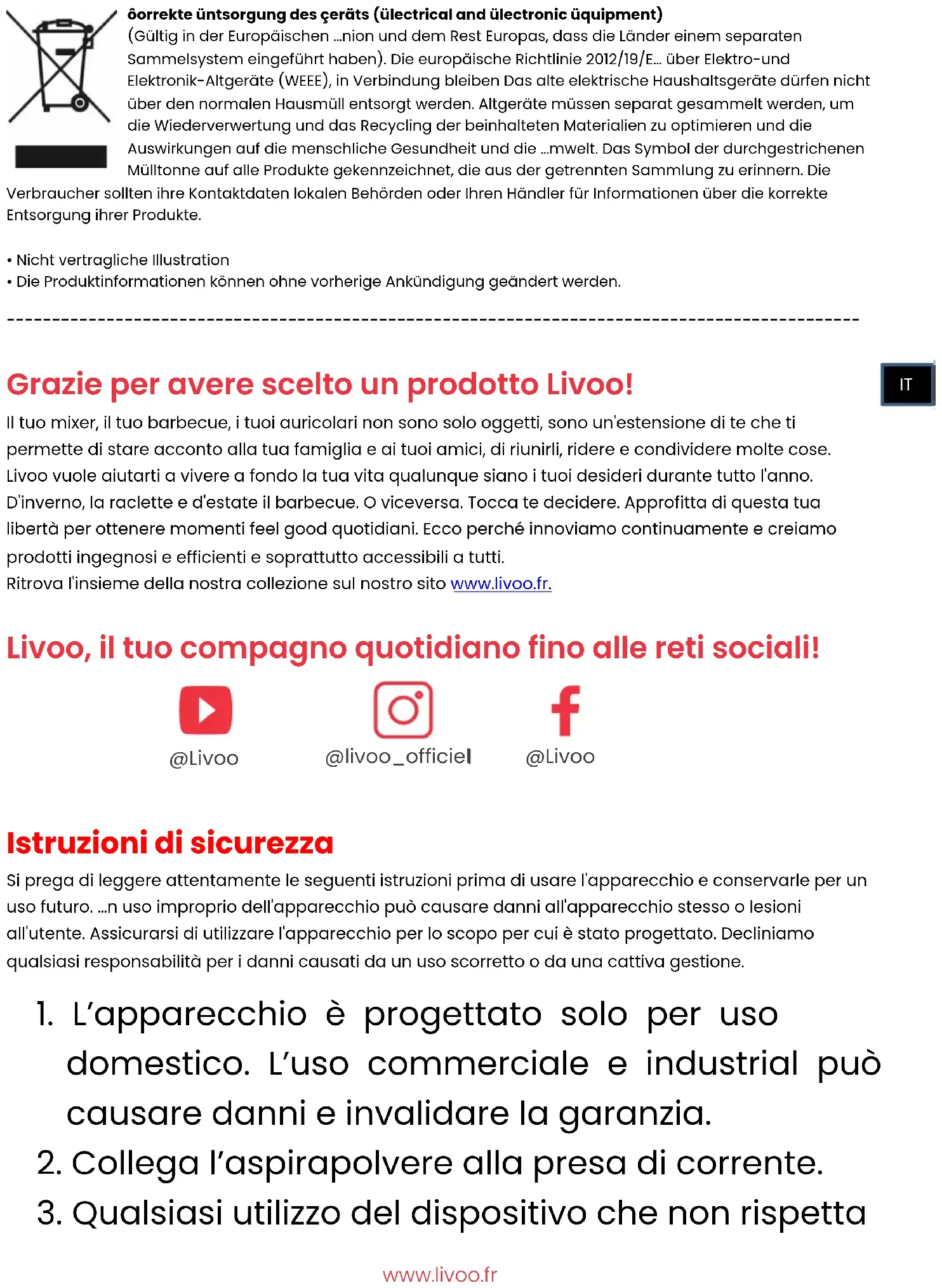 Grazie per avere scelto un prodotto Livoo! Il tuo mixer, il tuo barbecue, i tuoi auricolari non sono solo oggetti, sono un'estensione di te che ti permette di stare acconto alla tua famiglia e ai tuoi amici, di riunirli, ridere e condividere molte cose. Livoo vuole aiutarti a vivere a fondo la tua vita qualunque siano i tuoi desideri durante tutto l'anno. D'inverno, la raclette e d'estate il barbecue. O viceversa. Tocca te decidere. Approfitta di questa tua libertà per ottenere momenti feel good quotidiani. Ecco perché innoviamo continuamente e creiamo prodotti ingegnosi e efficienti e soprattutto accessibili a tutti. Ritrova l'insieme della nostra collezione sul nostro sito www.livoo.fr. Livoo, il tuo compagno quotidiano fino alle reti sociali!