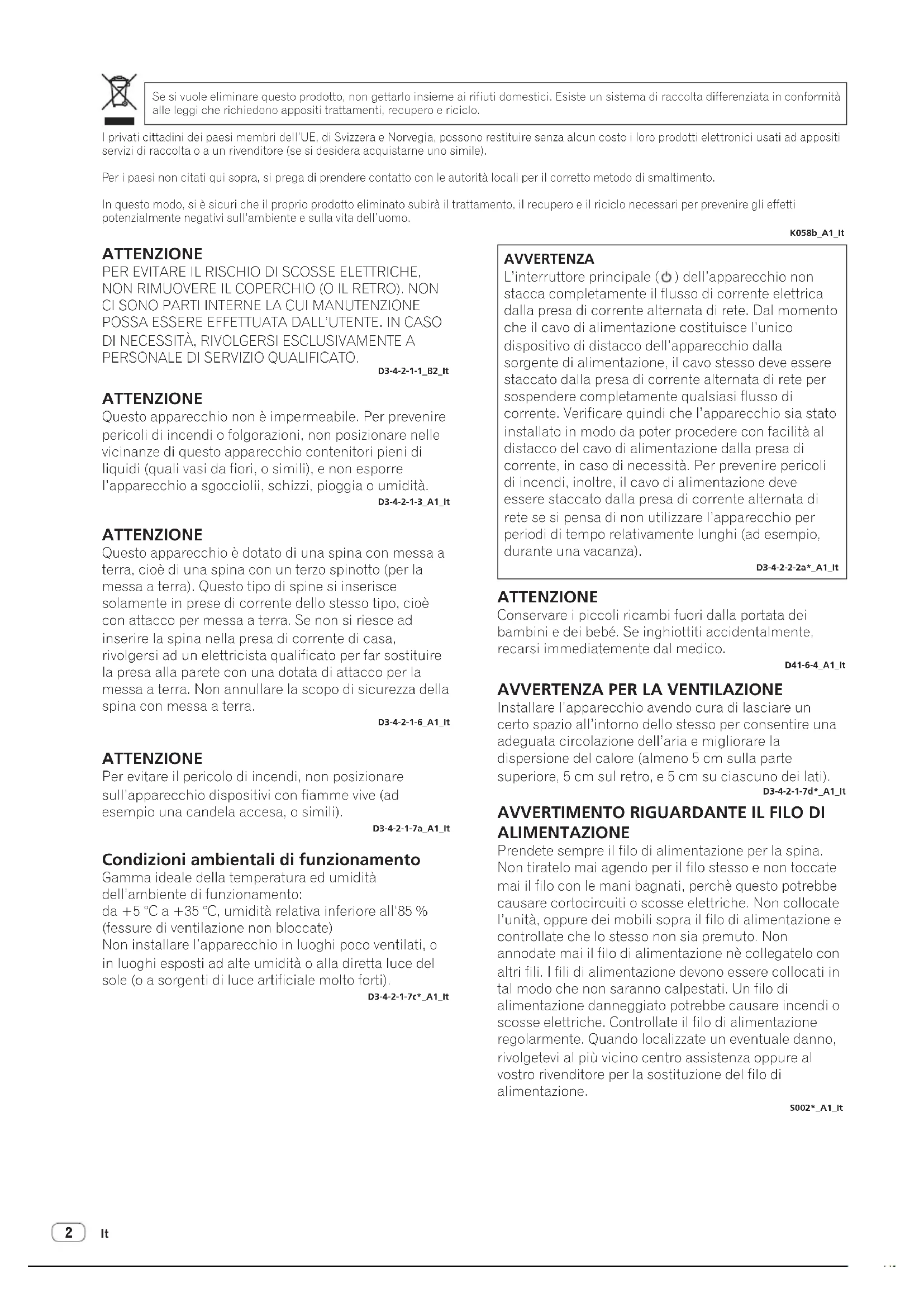 Installare l’apparecchio avendo cura di lasciare un certo spazio all’intorno dello stesso per consentire una adeguata circolazione dell’aria e migliorare la dispersione del calore (almeno 5 cm sulla parte superiore, 5 cm sul retro, e 5 cm su ciascuno dei lati). D3-4-2-1-7d*_A1_It AVVERTENZA L’interruttore principale ( ) dell’apparecchio non stacca completamente il flusso di corrente elettrica dalla presa di corrente alternata di rete. Dal momento che il cavo di alimentazione costituisce l’unico dispositivo di distacco dell’apparecchio dalla sorgente di alimentazione, il cavo stesso deve essere staccato dalla presa di corrente alternata di rete per sospendere completamente qualsiasi flusso di corrente. Verificare quindi che l’apparecchio sia stato installato in modo da poter procedere con facilità al distacco del cavo di alimentazione dalla presa di corrente, in caso di necessità. Per prevenire pericoli di incendi, inoltre, il cavo di alimentazione deve essere staccato dalla presa di corrente alternata di rete se si pensa di non utilizzare l’apparecchio per periodi di tempo relativamente lunghi (ad esempio, durante una vacanza). D3-4-2-2-2a*_A1_It ATTENZIONE Conservare i piccoli ricambi fuori dalla portata dei bambini e dei bebé. Se inghiottiti accidentalmente, recarsi immediatemente dal medico. D41-6-4_A1_It Se si vuole eliminare questo prodotto, non gettarlo insieme ai rifiuti domestici. Esiste un sistema di raccolta differenziata in conformità alle leggi che richiedono appositi trattamenti, recupero e riciclo. I privati cittadini dei paesi membri dell’UE, di Svizzera e Norvegia, possono restituire senza alcun costo i loro prodotti elettronici usati ad appositi servizi di raccolta o a un rivenditore (se si desidera acquistarne uno simile). Per i paesi non citati qui sopra, si prega di prendere contatto con le autorità locali per il corretto metodo di smaltimento. In questo modo, si è sicuri che il proprio prodotto eliminato subirà il trattamento, il recupero e il riciclo necessari per prevenire gli effetti potenzialmente negativi sull’ambiente e sulla vita dell’uomo. K058b_A1_It