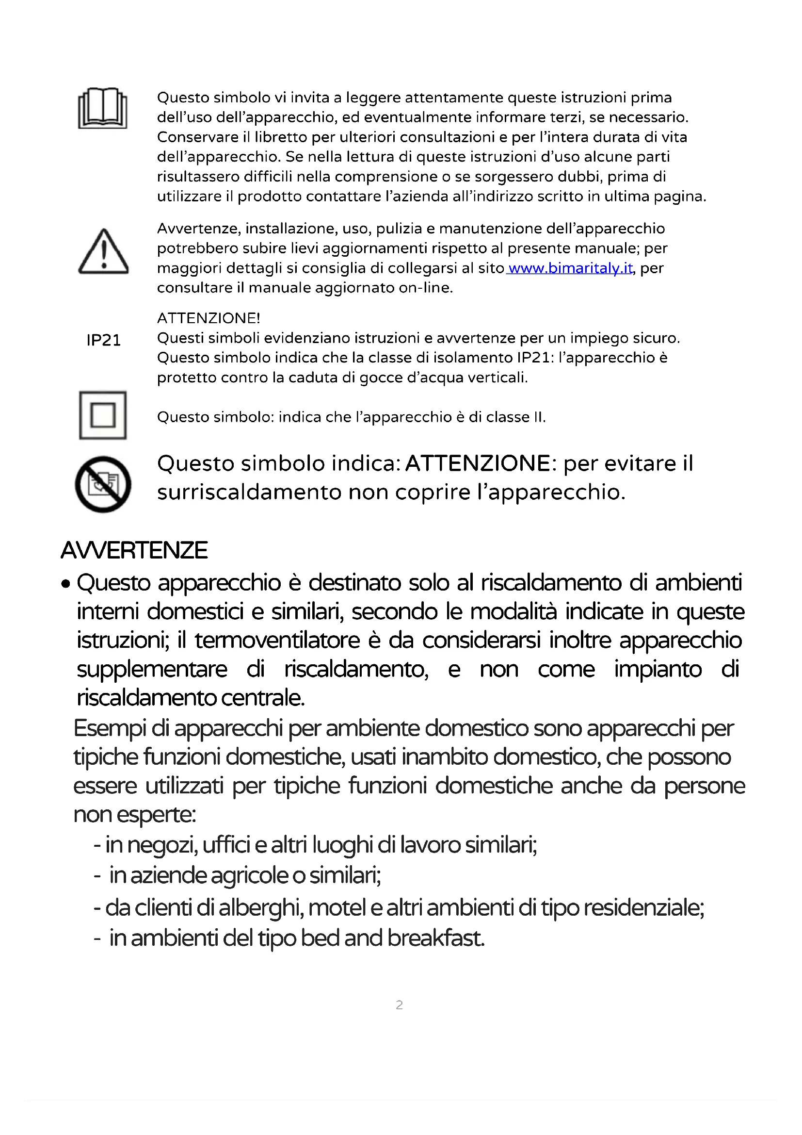Questo simbolo vi invita a leggere attentamente queste istruzioni prima dell’uso dell’apparecchio, ed eventualmente informare terzi, se necessario. Conservare il libretto per ulteriori consultazioni e per l’intera durata di vita dell’apparecchio. Se nella lettura di queste istruzioni d’uso alcune parti risultassero difficili nella comprensione o se sorgessero dubbi, prima di utilizzare il prodotto contattare l’azienda all’indirizzo scritto in ultima pagina. Avvertenze, installazione, uso, pulizia e manutenzione dell’apparecchio potrebbero subire lievi aggiornamenti rispetto al presente manuale; per maggiori dettagli si consiglia di collegarsi al sito www.bimaritaly.it , per consultare il manuale aggiornato on-line. ATTENZIONE! Questi simboli evidenziano istruzioni e avvertenze per un impiego sicuro. Questo simbolo indica che la classe di isolamento IP21: l’apparecchio è protetto contro la caduta di gocce d’acqua verticali. Questo simbolo: indica che l’apparecchio è di classe II. Questo simbolo indica: ATTENZIONE : per evitare il surriscaldamento non coprire l’apparecchio.3