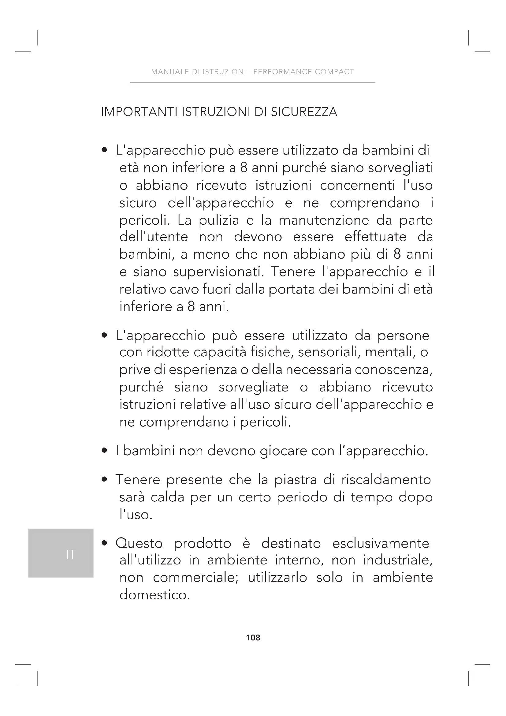 - L'apparecchio può essere utilizzato da bambini di età non inferiore a 8 anni purché siano sorvegliati o abbiano ricevuto istruzioni concernenti l'uso sicuro dell'apparecchio e ne comprendano i pericoli. La pulizia e la manutenzione da parte dell'utente non devono essere effettuate da bambini, a meno che non abbiano più di 8 anni e siano supervisionati. Tenere l'apparecchio e il relativo cavo fuori dalla portata dei bambini di età inferiore a 8 anni.